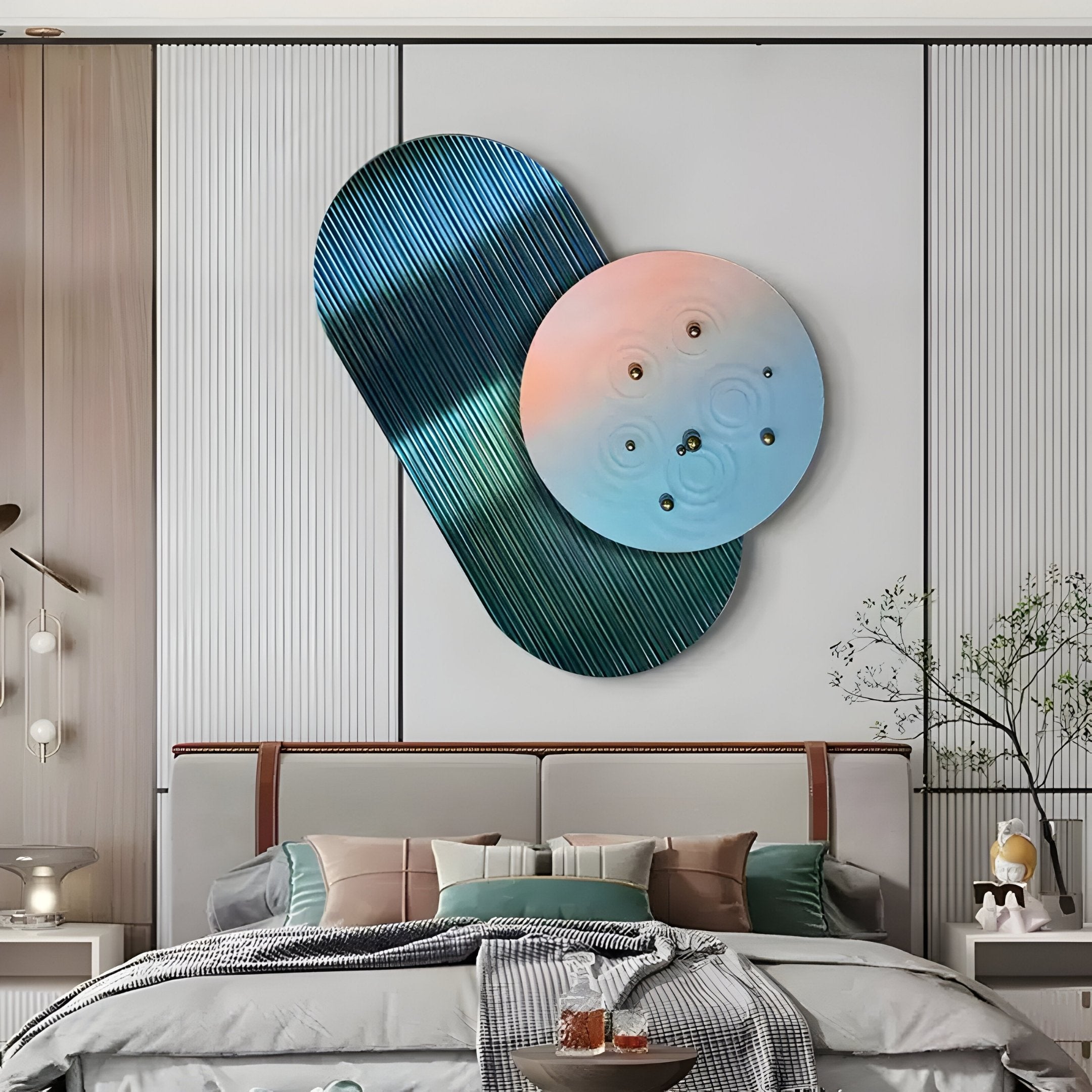 Crafted with a blend of corrugated acrylic, embossed sandstone, and fine wood carving, the Embera Abstract Circle Pastel Gradient 3D Wall Art stands out as a refined fusion of colour and texture. The elongated oval panel, rendered in a teal–blue spectrum, reveals corrugation that catches and refracts light for a softly shimmering effect. Overlapping this base is a circular disc featuring a gentle pastel gradient, shifting from warm peach to pale aqua. Concentric ripples, hand-painted onto the sandstone surface, invoke a sense of delicate motion, while strategically placed metallic knobs offer subtle highlights that enrich the overall composition.
