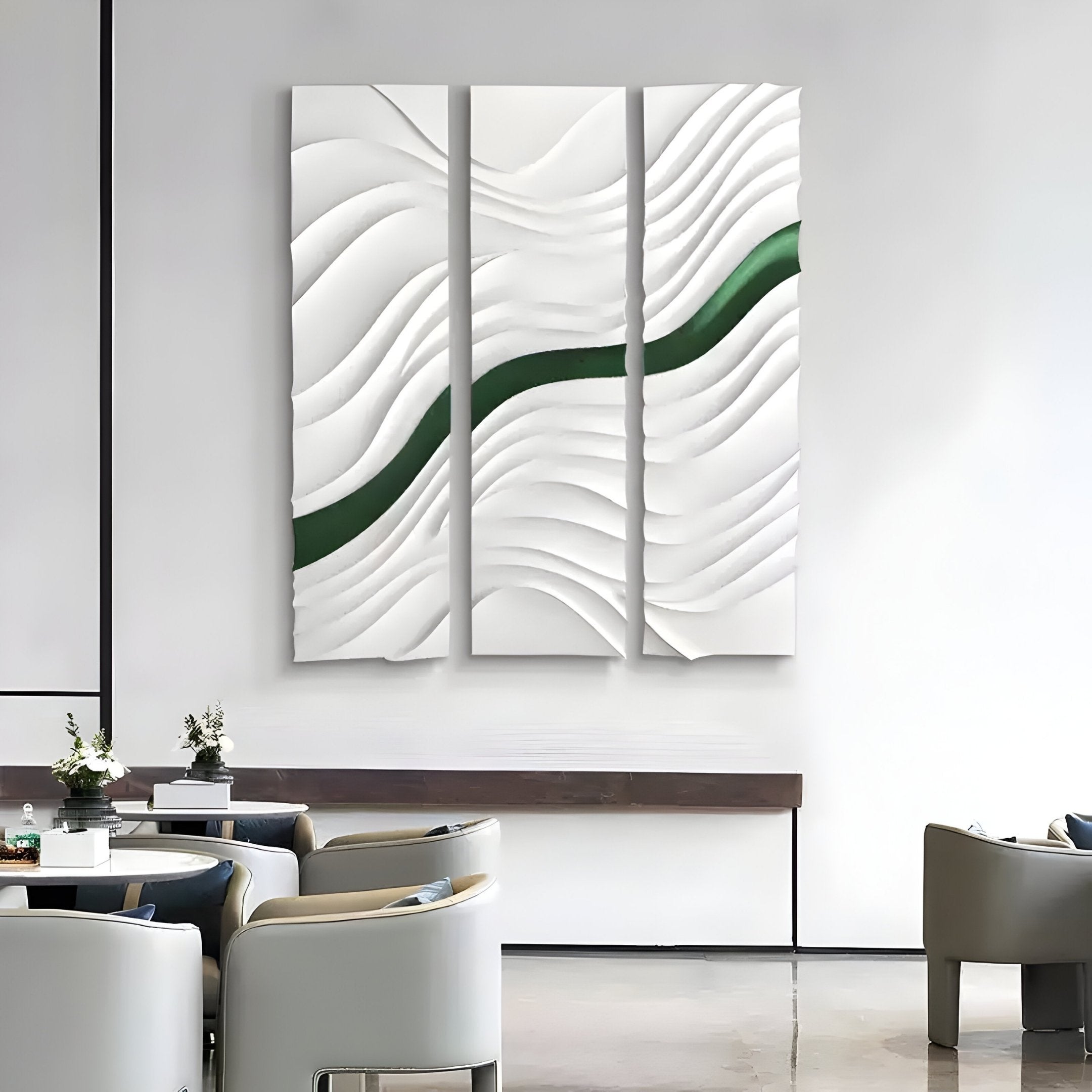Evolva 3-Panel White & Green Wood Relief 3D Wall Art features a sculptural landscape that moves with graceful rhythm across three connected panels. Hand-carved from wood, the flowing surface of each panel creates a seamless transition of curves and ridges, drawing the eye horizontally across the composition. At the centre, a deep green painted stripe cuts through the form with fluid intent, offering contrast and natural energy. Its placement mimics a river or valley, weaving through the textured terrain with a quiet yet dynamic presence. The carved surface plays with light and shadow throughout the day, giving the artwork a living quality that evolves in real time.