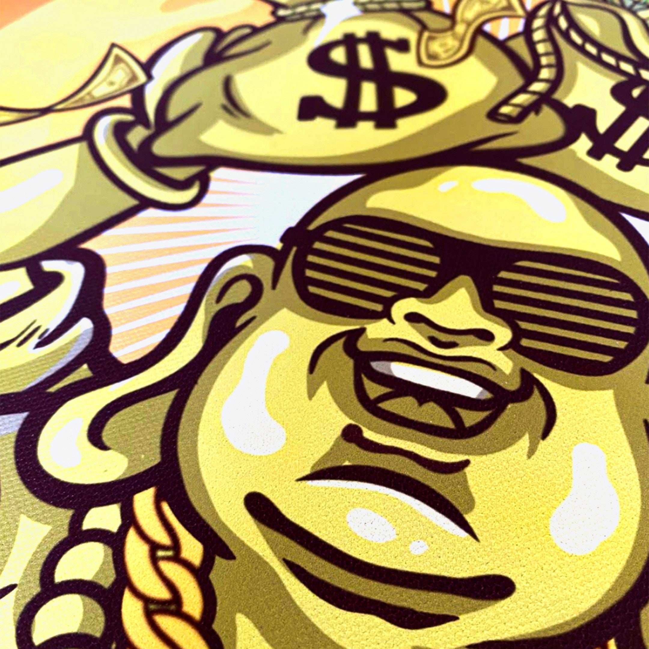 Filthy Rich Canvas Wall Art takes the iconic Smiling Buddha and turns up the volume, way up. Draped in gold, shades on, and surrounded by symbols of extravagant success, this reimagined deity isn’t just content with good fortune, he embodies a lifestyle of unapologetic abundance. With dollar signs, bold outlines, and street-style flair, this digital print brings divine prosperity into the realm of pop culture excess. Rendered in blazing tones of gold and orange, the artwork bursts with high-energy opulence. The classic peaceful grin now beams with billionaire confidence. It’s a celebration of hustle, luxury, and ambition, served with a heavy dose of humor and graphic punch.