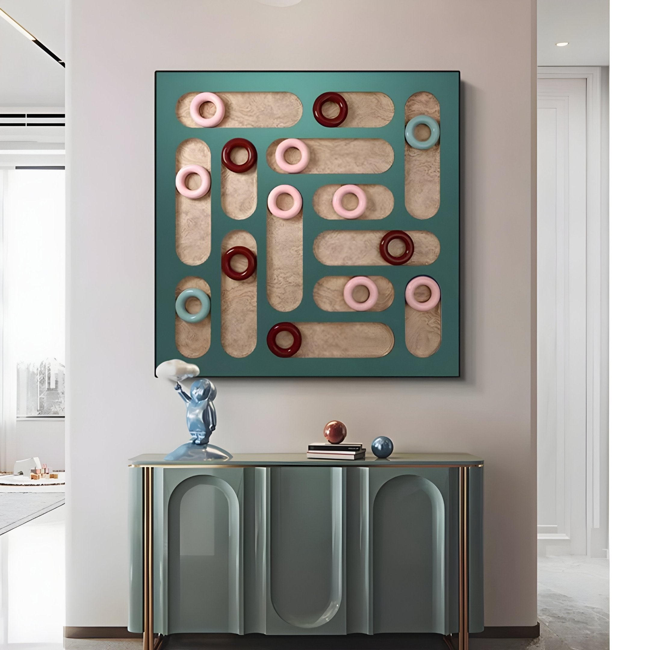 Featuring an array of ring-shaped cut-outs and soft, rounded forms, the Formexa Ring Geometric Wood Relief 3D Wall Art brings a playful yet composed energy to modern spaces. Each circular piece, carved from solid wood and treated with complementary finishes, appears to float within the grid-like arrangement of oval cut-outs. Gentle pastels, earthy browns, and pops of rich colour combine on a subdued green panel, balancing upbeat hues with a sophisticated palette. Ideal for a hallway, lounge, or home office, the artwork’s geometric design alludes to Nordic influences, emphasising clarity of form and a harmonious mix of shades.