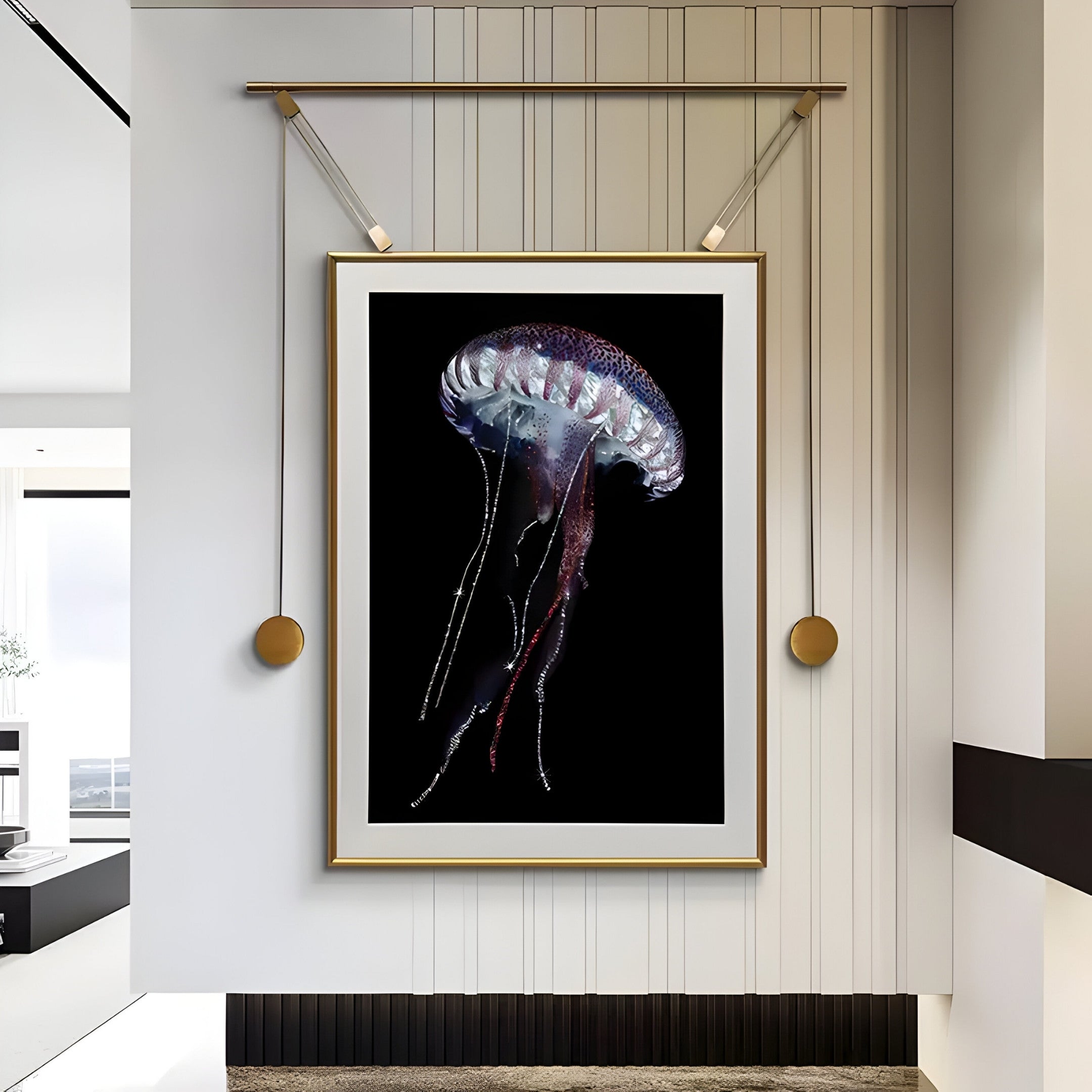 Perfect for indoor environments, this framed wall art elevates spaces with its bold yet serene marine-inspired design. Ideal for living rooms, dining areas, or entryways, the Glacia Jellyfish artwork becomes a captivating centrepiece. Its elegant hanging installation enhances its artistic charm while seamlessly integrating into modern, coastal, or transitional decor themes. Whether displayed as a standalone piece or part of a curated gallery wall, its unique composition offers a timeless visual appeal, bringing a touch of oceanic beauty to your interiors.