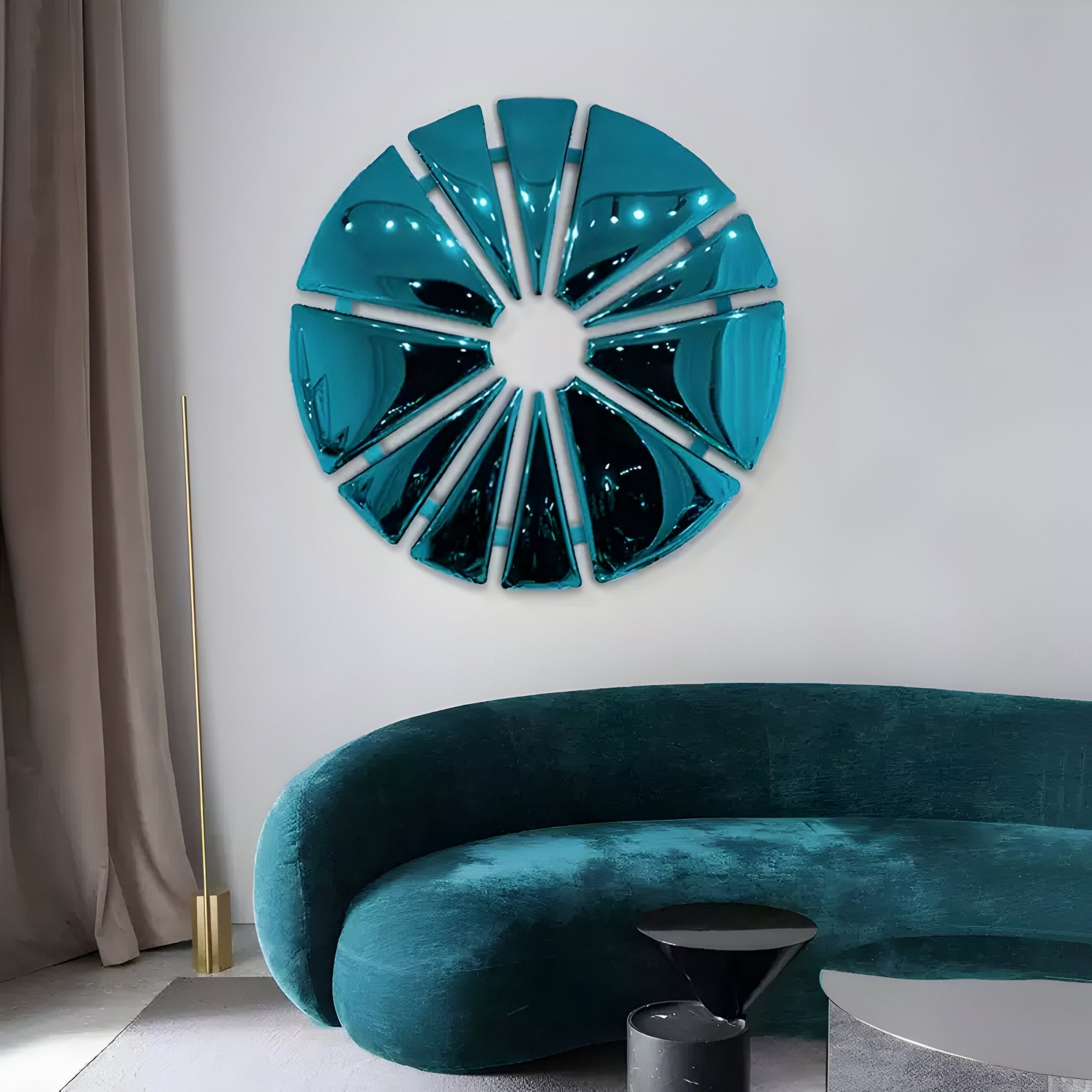 This metal wall art offers versatility, fitting seamlessly into a range of interior designs, from minimalist to eclectic. Its vibrant aqua tones and geometric form draw attention, while the polished surface adds a touch of refinement. Perfect for indoor placement, this circular art piece enhances the character of large living spaces, entrance halls, or upscale commercial environments. The carefully crafted segments create a sense of movement and balance, ensuring it remains a captivating focal point.