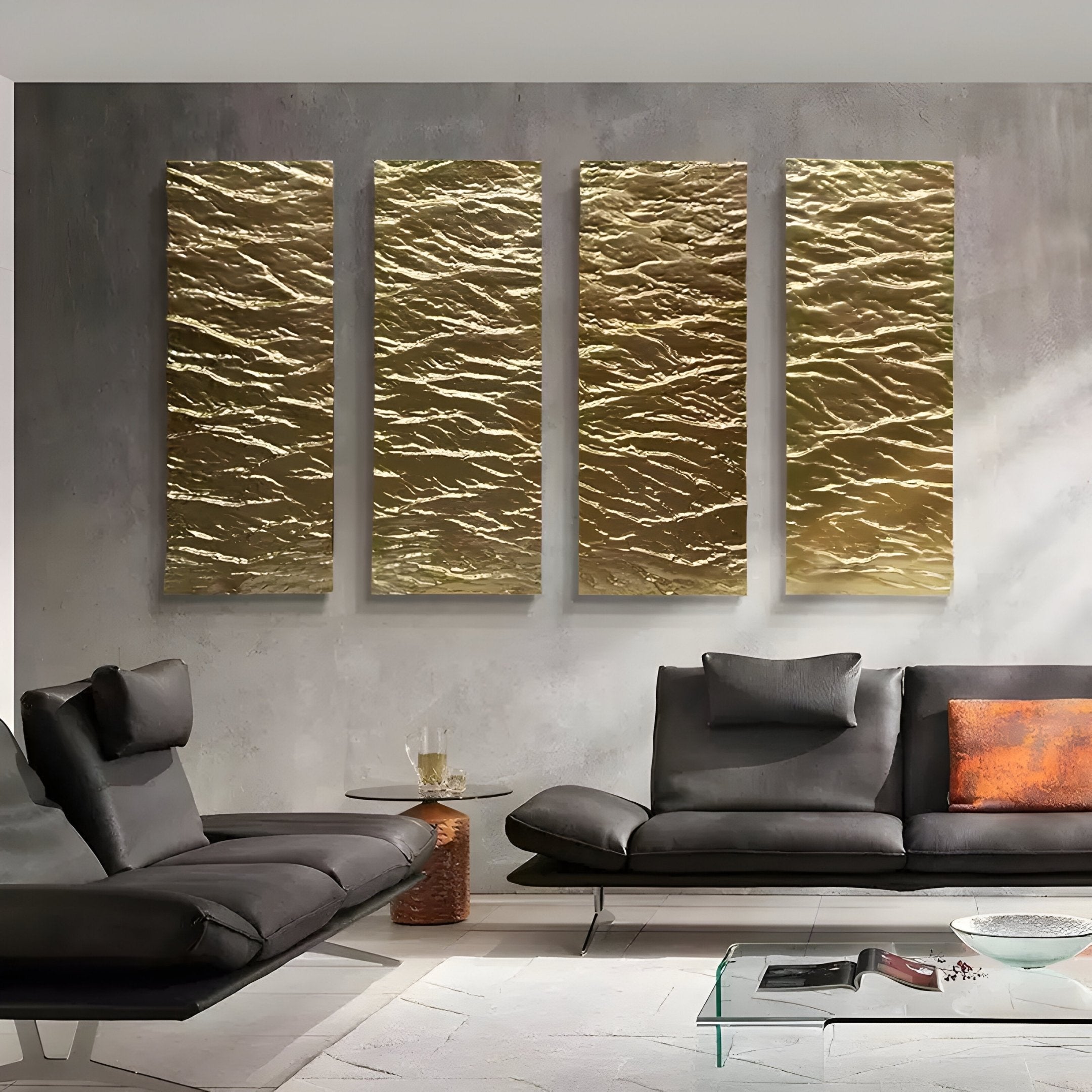The Illume 4-Panel Gold Hand-Painted Wood Relief 3D Wall Art brings a bold yet refined statement to any interior setting. Each panel is meticulously crafted from wood, then adorned with a warm gold finish that strikes a balance between glossy highlights and subdued matte undertones. The dimensional relief design suggests flowing wave-like patterns, creating a sense of movement and capturing the light in fascinating ways. Hand-painted details lend a nuanced visual texture, and the uniform arrangement of the four panels forms a harmonious composition. Whether displayed in a living room, hallway, or porch entrance, this wall art radiates an understated opulence that pairs well with a range of décor styles. The shimmering gold hue draws immediate attention, inviting closer inspection of its intricate contours.