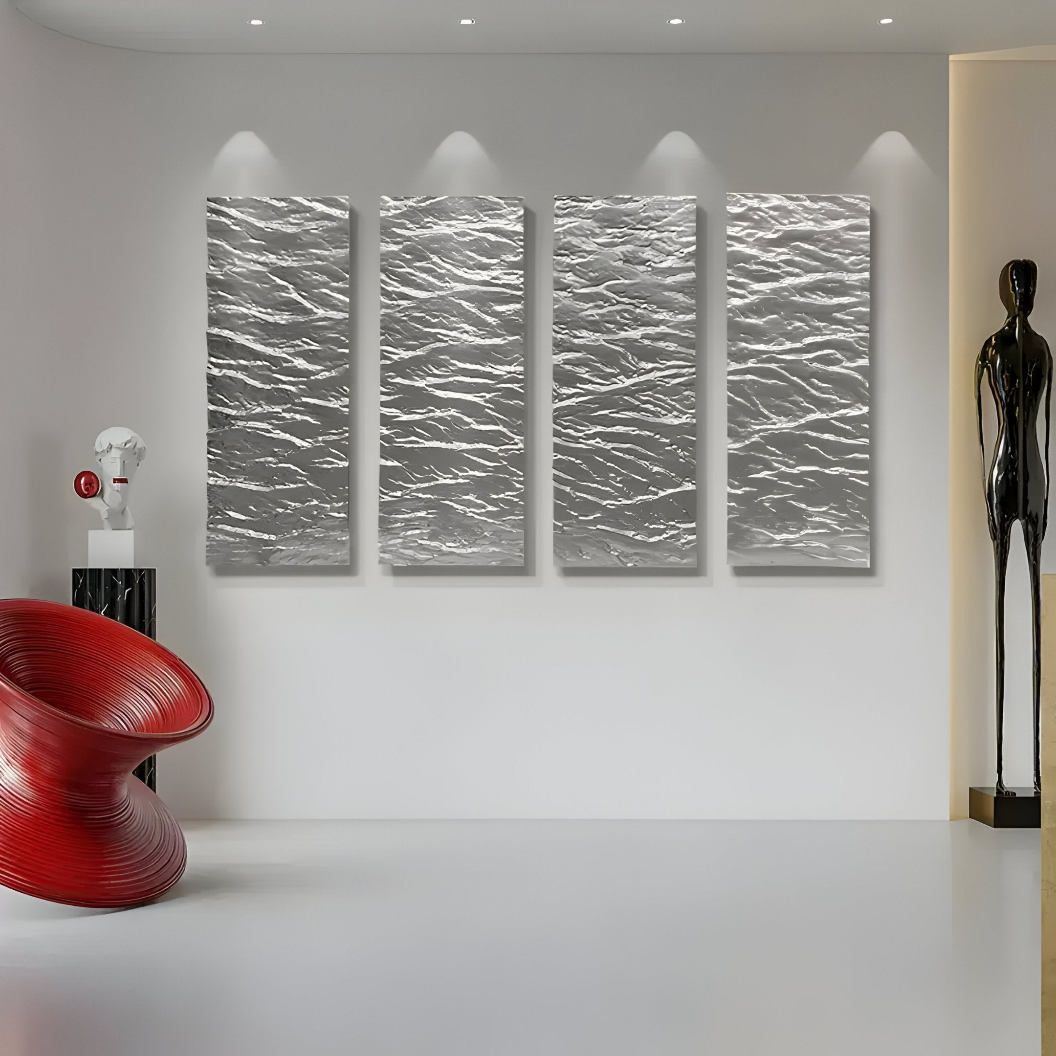 Whether installed in a living room, hallway, or reception area, this wall art exudes understated luxury without overpowering surrounding décor. Its neutral yet metallic hue complements minimalist designs, yet it can also add balance to bold colour schemes. The vertical orientation draws the eye upward, making walls appear taller and rooms feel more expansive. Each panel can be spaced differently to achieve the exact visual rhythm you desire. This customisable arrangement not only ensures versatility but also makes it easy to adapt if you redecorate. The wood relief’s contemporary flair blends with its timeless, wave-like form, ensuring that this art set remains relevant through changing trends. Providing both textural interest and reflective shine, the Illume 4-Panel Silver Hand-Painted Wood Relief 3D Wall Art is ideal for those seeking a statement piece that effortlessly refines the ambience of any interior setting.