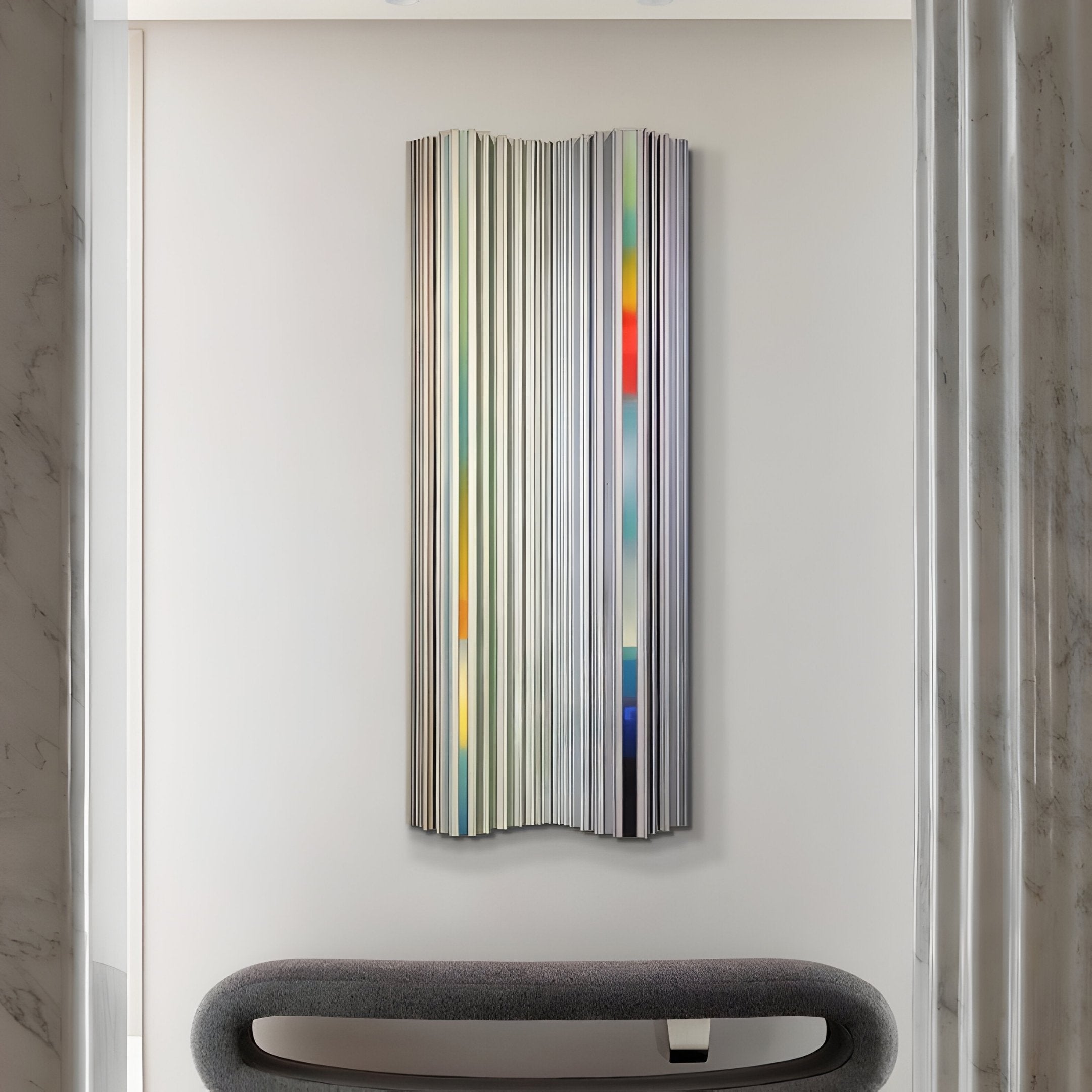 This wall art serves as a bold centrepiece for interiors that value both contemporary and artistic expression. The vertical orientation and flowing design make it ideal for spaces with high ceilings or as a statement piece in entryways, living rooms, or office settings. The chromatic streaks imbue life and energy into minimalist spaces, while the structured wooden form offers a sense of order and sophistication. Its ability to catch and play with light ensures a dynamic presence, adding movement and depth to your environment. Whether in a residential or commercial setting, this artwork delivers a visual impact that is both artistic and engaging.