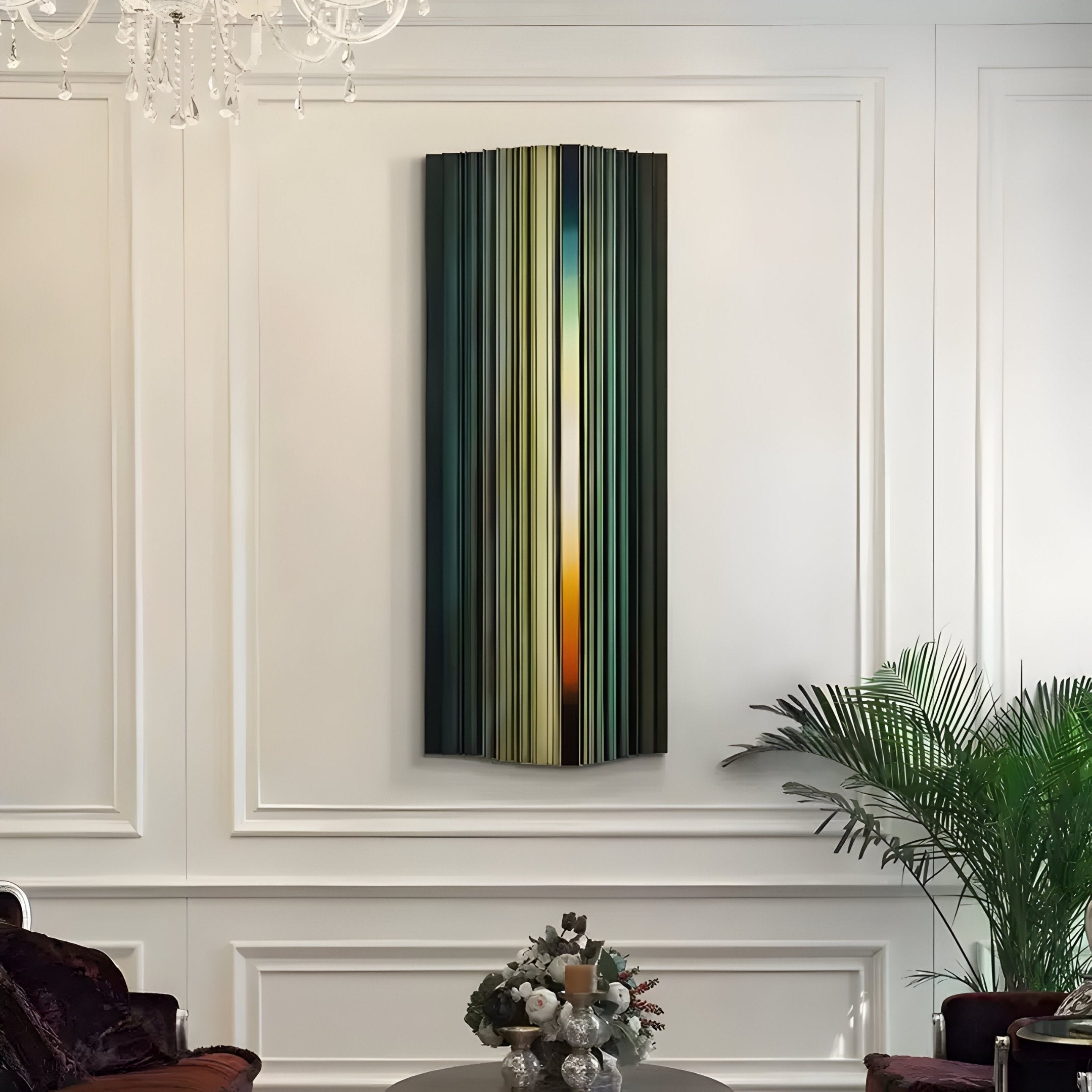 The Illumina Green Colourful Vertical Wooden Hand-Painted 3D Wall Art is an exquisite example of contemporary craftsmanship, combining vibrant hand-painted details with a sleek wooden structure. Its design features a series of vertical ridges painted in an earthy green base, with colourful accents seamlessly blending into the surface. Each ridge captures subtle changes in hue, creating a shifting visual experience as the light interacts with its texture. The vertical format adds a sense of height and structure, making it an excellent choice for larger walls or spaces requiring a commanding focal piece.