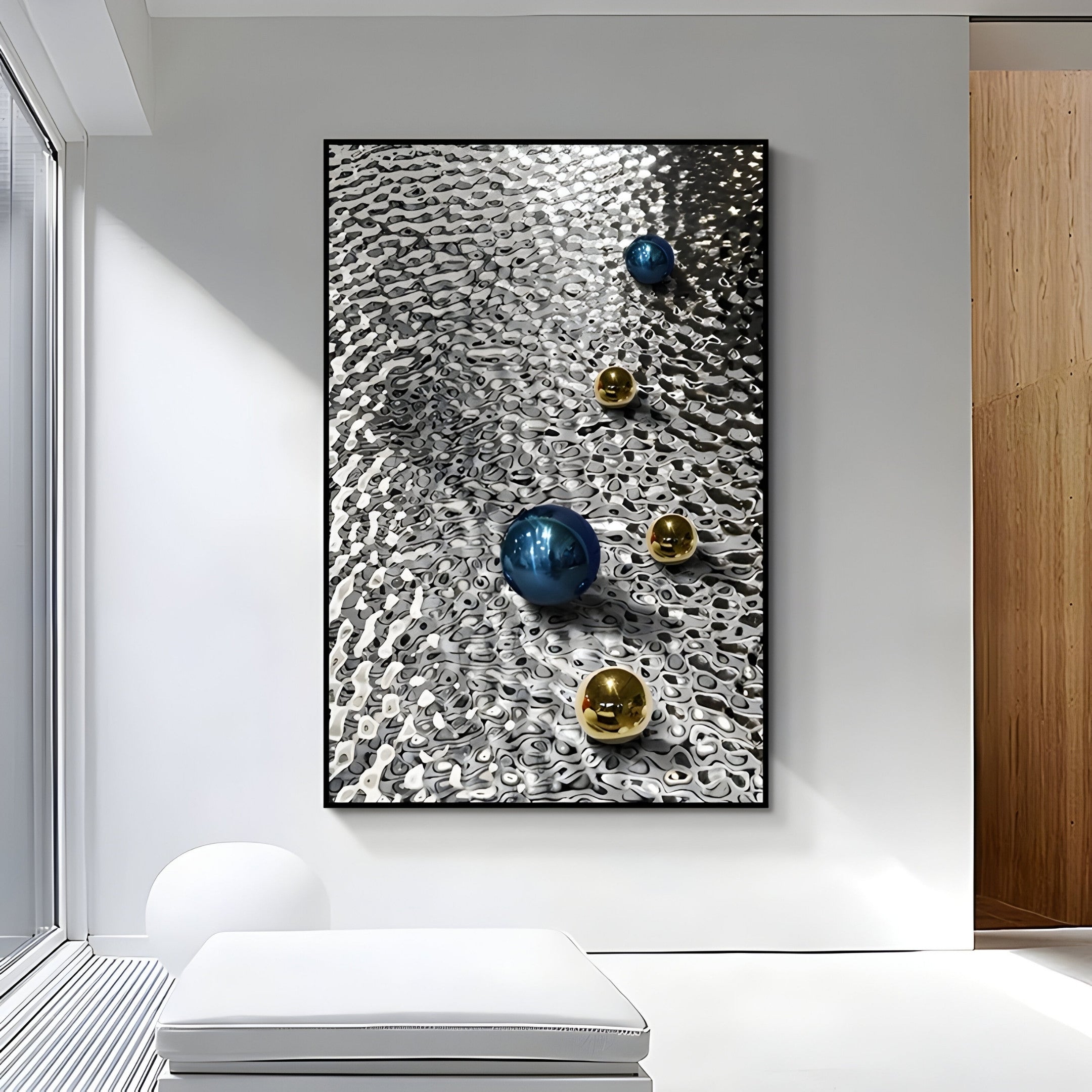 Perfectly suited for indoor spaces, this artwork fits seamlessly into living rooms, offices, lobbies, and hallways. The interplay of metallic tones against the rippled backdrop adds sophistication to minimalist spaces, while the bold colours of the orbs bring a vibrant touch. Durable and easy to maintain, the stainless steel construction ensures longevity, making it a practical yet artistic choice for various settings. Whether mounted in a brightly lit foyer to enhance its reflective qualities or placed in a cosy living room to add depth, this wall art adapts beautifully to diverse environments.