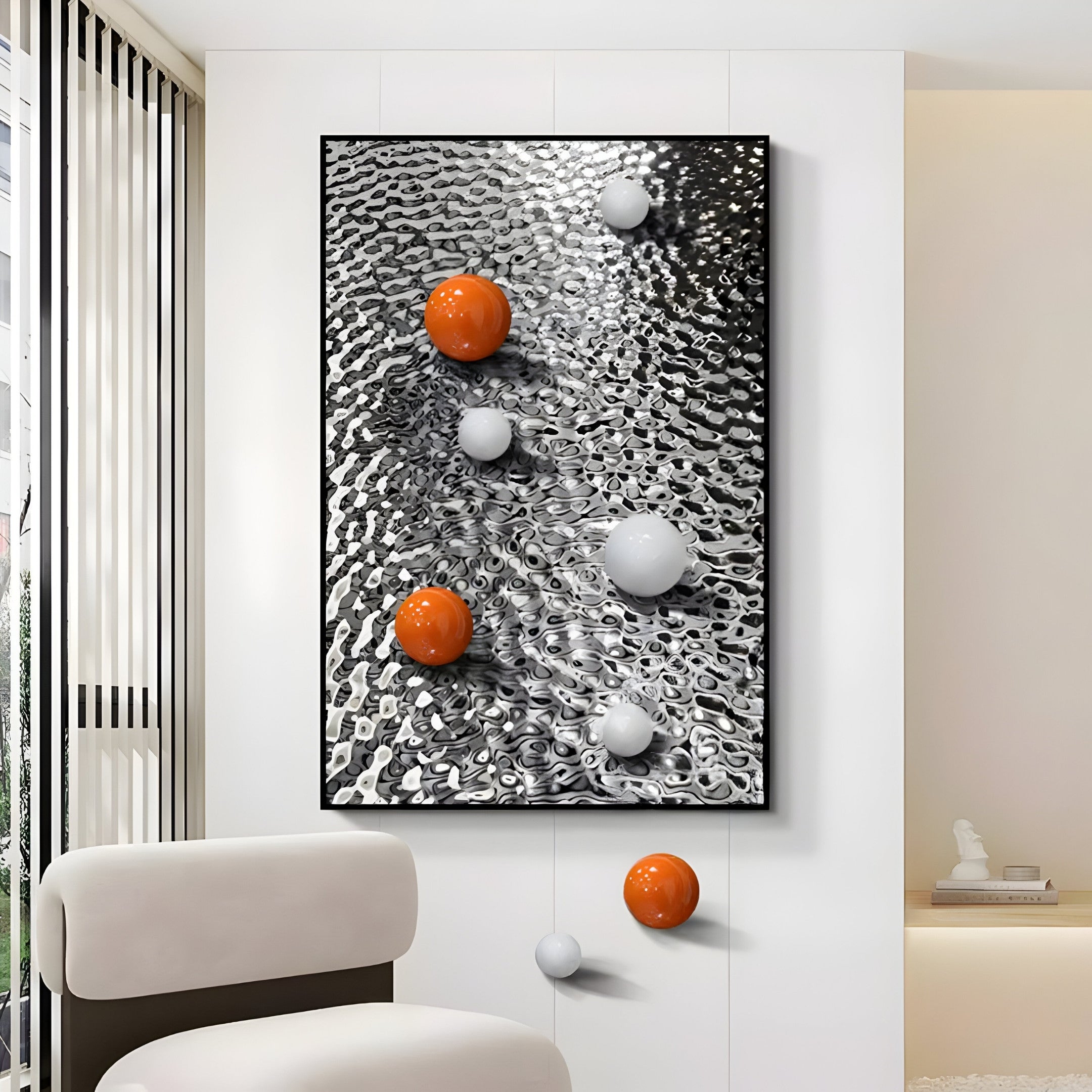 The Luminosa Orange & White Orb Textured Metal Wall Art blends bold and modern aesthetics, showcasing striking orange and white orbs set against a rippled stainless-steel background. Each orb seems to float, creating a dynamic and three-dimensional visual effect that draws the eye and evokes a sense of movement. The intricately corrugated steel surface enhances the interplay of light and shadow, providing an elegant contrast to the vibrant spheres. Crafted with premium materials, this installation piece is a perfect fit for contemporary interiors, adding a splash of modern artistry.