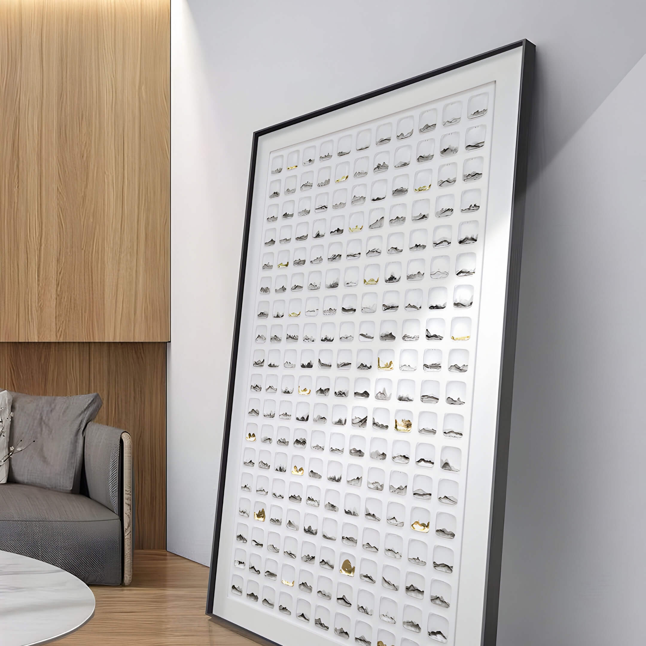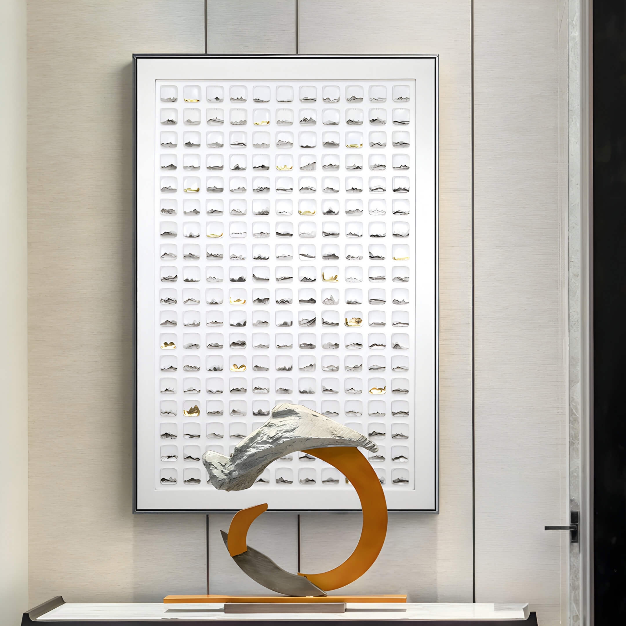 Showcase refined artistry with this 3D ceramic wall art, featuring hand-painted designs and a metal frame. Arranged in a clean grid pattern, each ceramic piece measures 6x6 cm and is adorned with soft grey brushstrokes and striking gold foil accents. The combination of smooth ceramic textures, painted details, and reflective gold elements creates depth and movement, making it a sophisticated focal point in any interior. The polished metal frame enhances the artwork’s contemporary appeal, adding structure and elegance while protecting the delicate ceramic tiles. This statement piece works beautifully in modern living rooms, luxury dining spaces, professional offices, or upscale hospitality settings. Each ceramic tile is crafted with exceptional precision, ensuring durability and a tactile finish. The hand-painted grey tones mimic abstract natural patterns, while the radiant gold foil catches ambient light, adding a subtle shimmer that changes throughout the day.