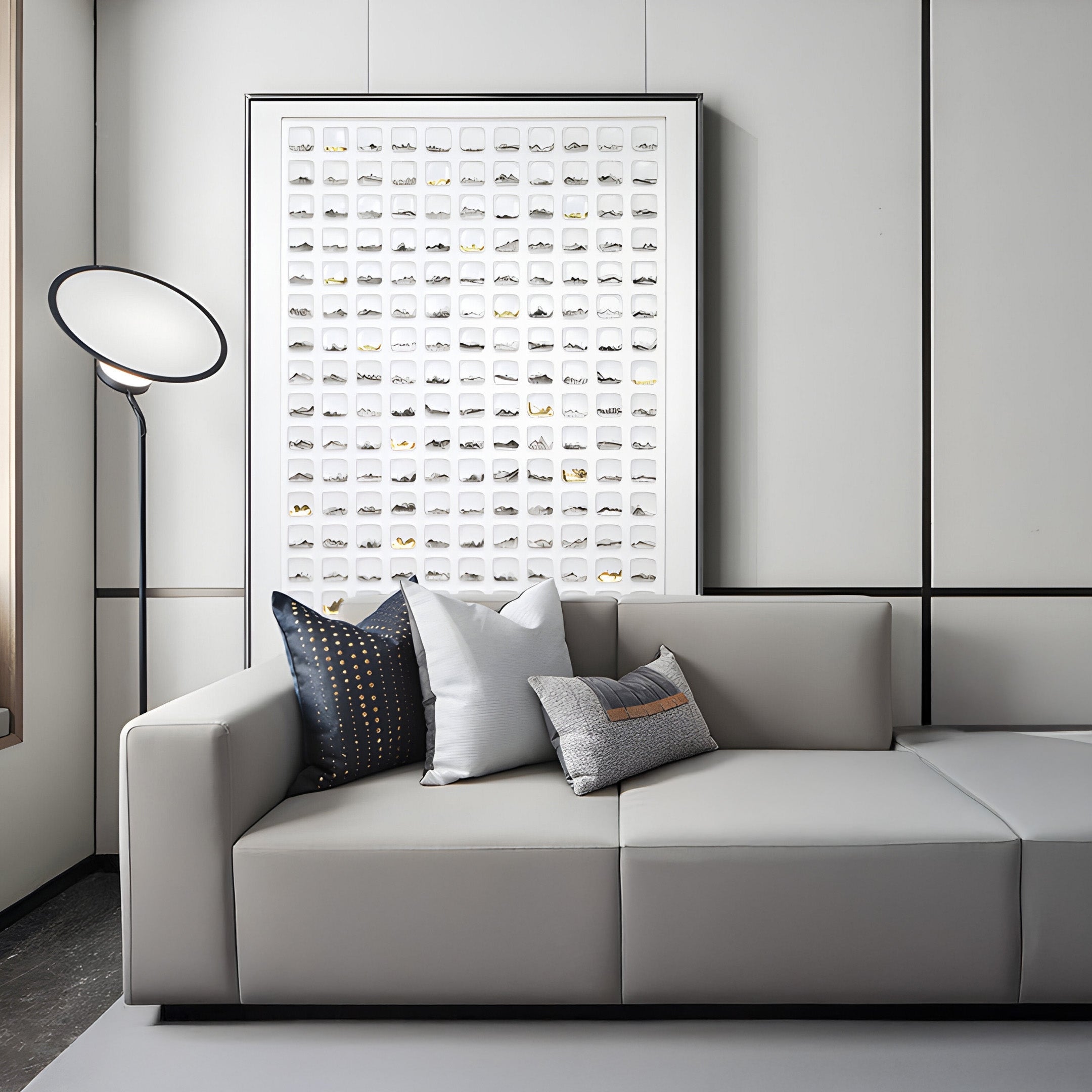 Bring texture, depth, and elegance to modern interiors with 3D ceramic wall art. The carefully hand-painted tiles, adorned with gold leaf, are arranged in a grid and framed with metal for a refined finish. Each 6x6 cm ceramic tile adds its own subtle charm, combining soft grey tones with the warmth of gold highlights. The gold leaf accents catch ambient light, creating an eye-catching shimmer that enhances the artwork’s visual appeal. With its refined textures and radiant highlights, this wall art captures the play of light and shadow throughout the day. The hand-painted brushwork and gold leaf detailing ensure that each ceramic piece adds character, making this installation a unique and lasting addition to upscale interiors.