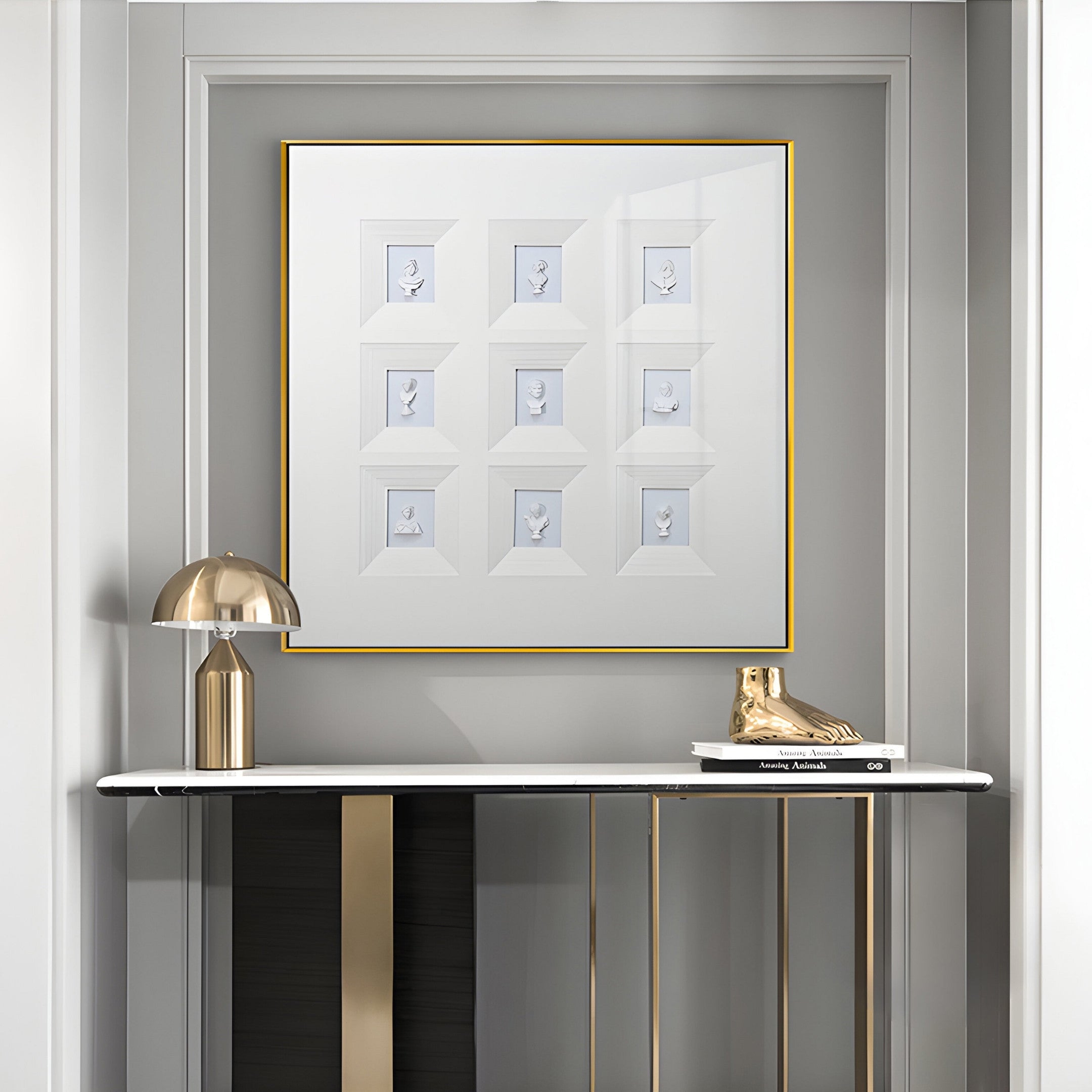 This layered composition showcases a series of plaster busts, each meticulously placed within stepped cardboard frames to create a neat, three-dimensional grid. The crisp white tones highlight the sculpted contours of every statue, drawing attention to classical-inspired details. A subtle sense of depth emerges from the staggered cardboard layers, while the square layout keeps the design balanced. It suits a range of interiors, offering an understated yet engaging focal point.