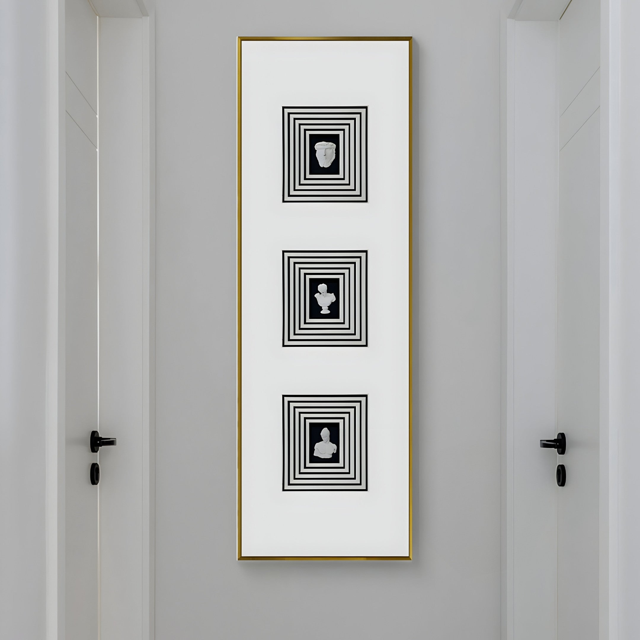A striking blend of plaster sculpture and layered cardboard, the Lustre Black & White Plaster Statue Vertical Wall Art offers a refined approach to modern decorative painting. Its vertical format emphasises graceful proportions, drawing the eye upwards to appreciate each carefully placed detail. A monochrome palette contrasts sharply against the textured background, while an aluminium frame unifies these elements into one cohesive piece. Taking cues from luxury French character art, this design echoes classic themes in a fresh, contemporary way. The plaster statue at its centre adds a three-dimensional focal point, allowing light to play across the sculpted surface and create an air of understated sophistication.