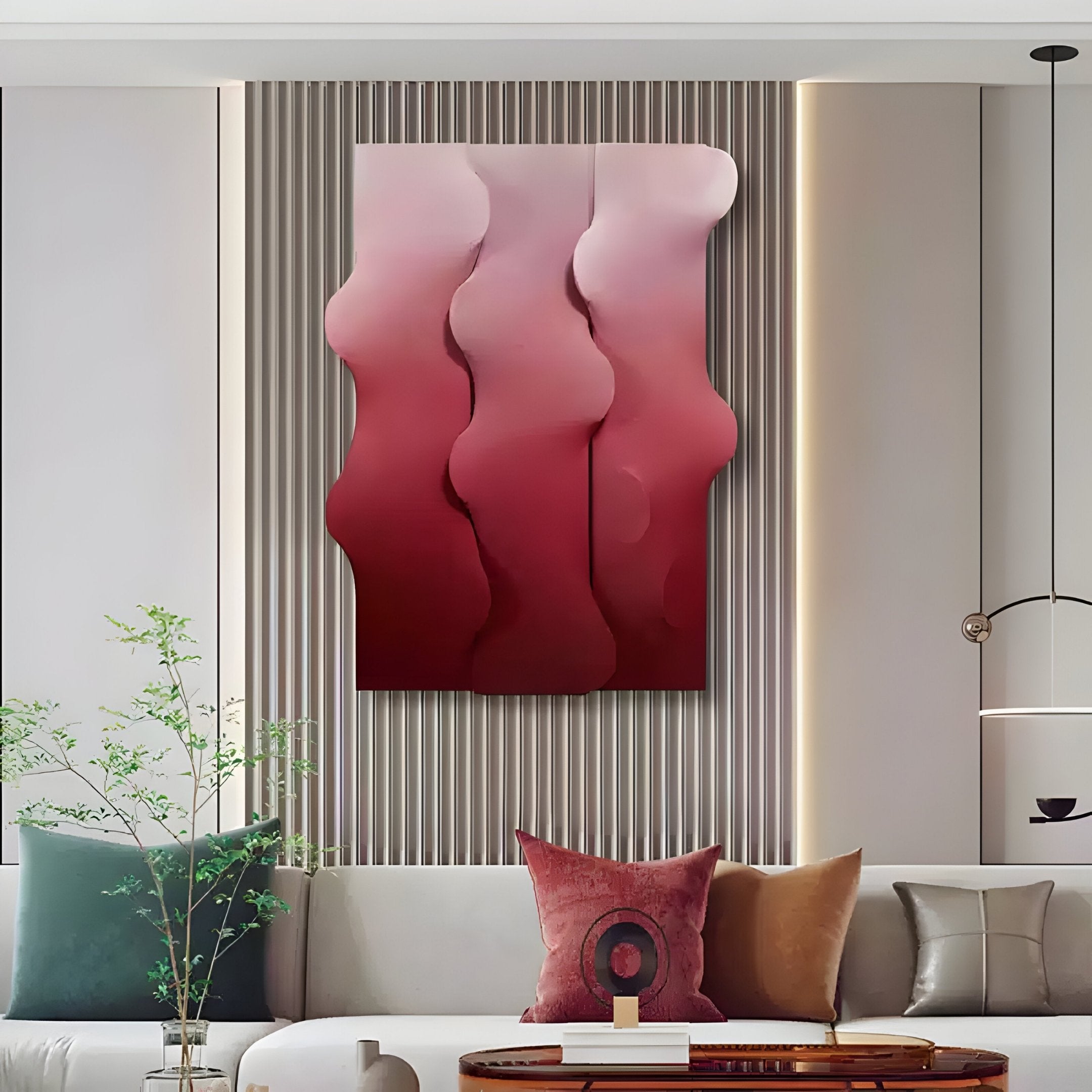Composed of elegantly curved panels, the Mystique Red Fabric Abstract Wood Relief 3D Wall Art adds a vivid burst of colour and texture to modern interiors. Elastic fabric is seamlessly stretched over a contoured wood base, forming an eye-catching gradient that transitions from intense crimson at the lower edge to softer pink hues nearer the top. As light interacts with the layered curves, the piece takes on intriguing shadows and highlights, emphasising the design’s dynamic presence. Observed up close, the taut fabric and subtle variations in colour hint at the high level of craftsmanship, while from afar, the sweeping forms come together to create a visually stunning focal point. Perfect for living rooms, entrance corridors, or contemporary dining areas, it offers a refreshing alternative to traditional flat canvases.