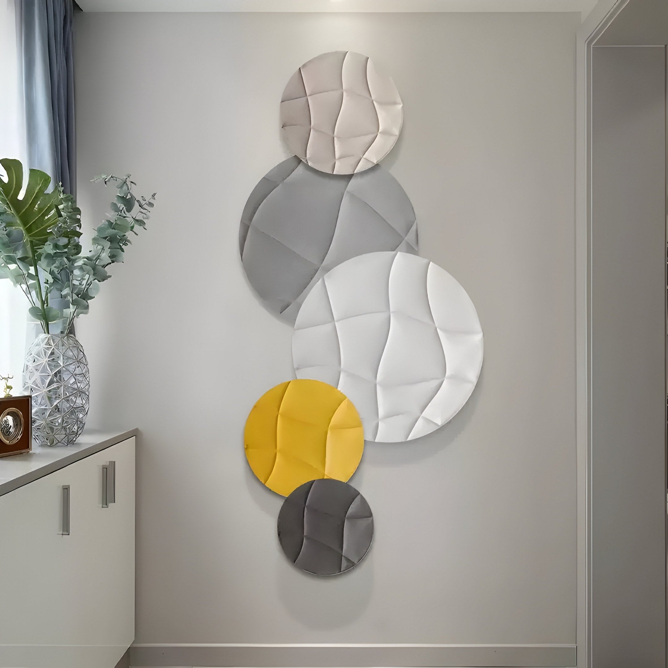 Designed for indoor use, this set can be customised to suit your wall space, giving you the freedom to cluster or space out the panels as desired. The neutral greys blend smoothly with various décor styles, while the single yellow accent adds a lively focal point. Each circular piece is built with a sturdy wooden core, ensuring durability and consistent shape over time. A quick dusting is all that’s needed to keep the surfaces looking fresh, and the colours remain vibrant with minimal upkeep. If you’re searching for a modern statement that fuses texture, shape, and contrasting tones, this multi-panel ensemble offers a versatile solution. Its sculptural form and mix of grey and yellow shades ensure it remains a talking point in any contemporary interior.