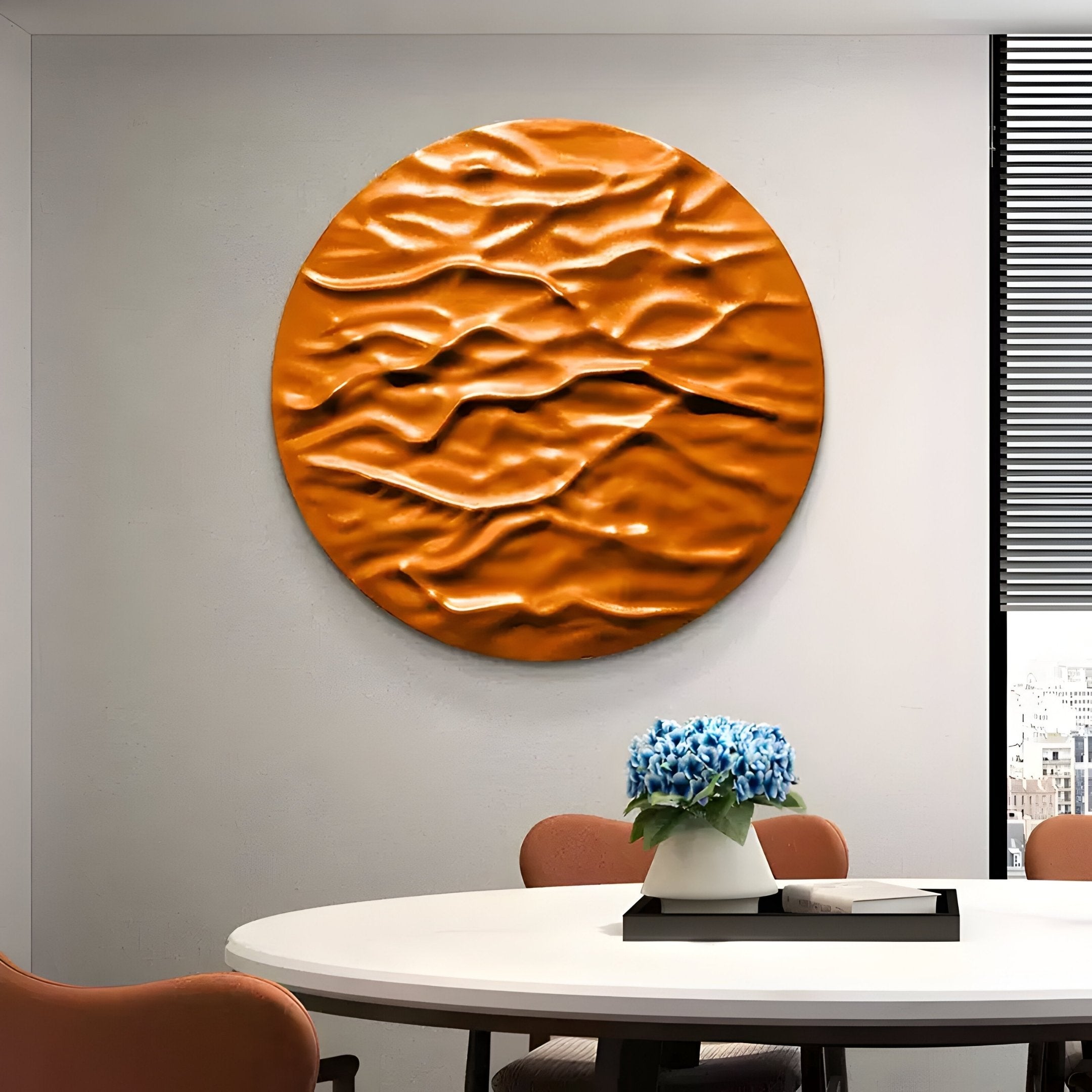 Carved from solid wood and finished in a vibrant orange hue, the Orenda Ripple Wave Orange Wood Relief 3D Wall Art brings a bold yet refined presence to any interior. Its circular form is characterised by softly flowing ridges that capture and reflect light, establishing an ever-changing interplay of highlights and shadows throughout the day. Inspired by Japanese minimalist aesthetics, the design concentrates on organic lines, exuding both warmth and serenity. This radiant colour choice injects energy into a living room or porch, while maintaining the restful qualities of a wave-like motif that brings calm to modern and eclectic décors alike.