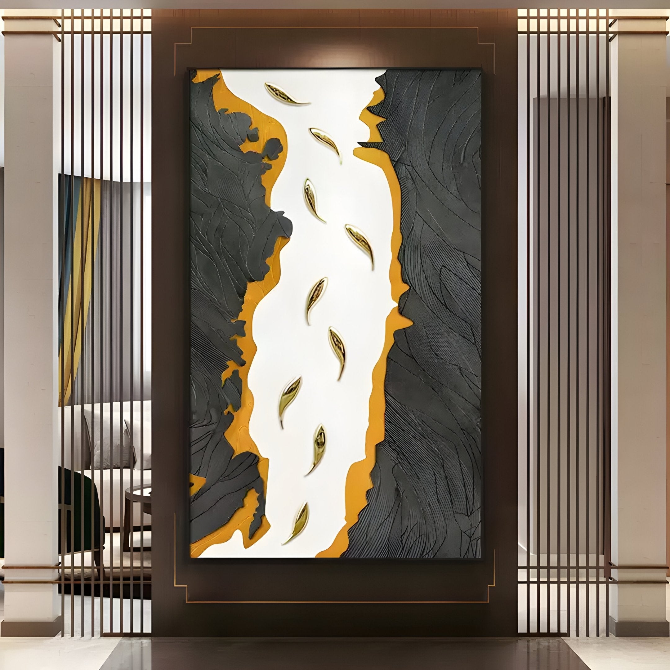 Emphasising a flowing vertical channel lined with nine gleaming fish, the Prosper Black & Amber Metallic Fish 3D Relief Wall Art introduces a blend of contrast and symbolism. Clad in black edges and amber accents, the carved background evokes rugged stone or layered rock surfaces, while a central white space provides a bright, visually striking path. Each electroplated fish, finished in gleaming gold, appears to swim upward, evoking themes of prosperity and positive energy. Crafted from a sandstone-like material with carefully etched details, the relief imbues any interior, be it a lofty entrance, a spacious living room, or an upscale villa corridor, with a refined yet organic atmosphere. Soft variations of light throughout the day bring out subtle highlights on both the textured surface and the lustrous fish.