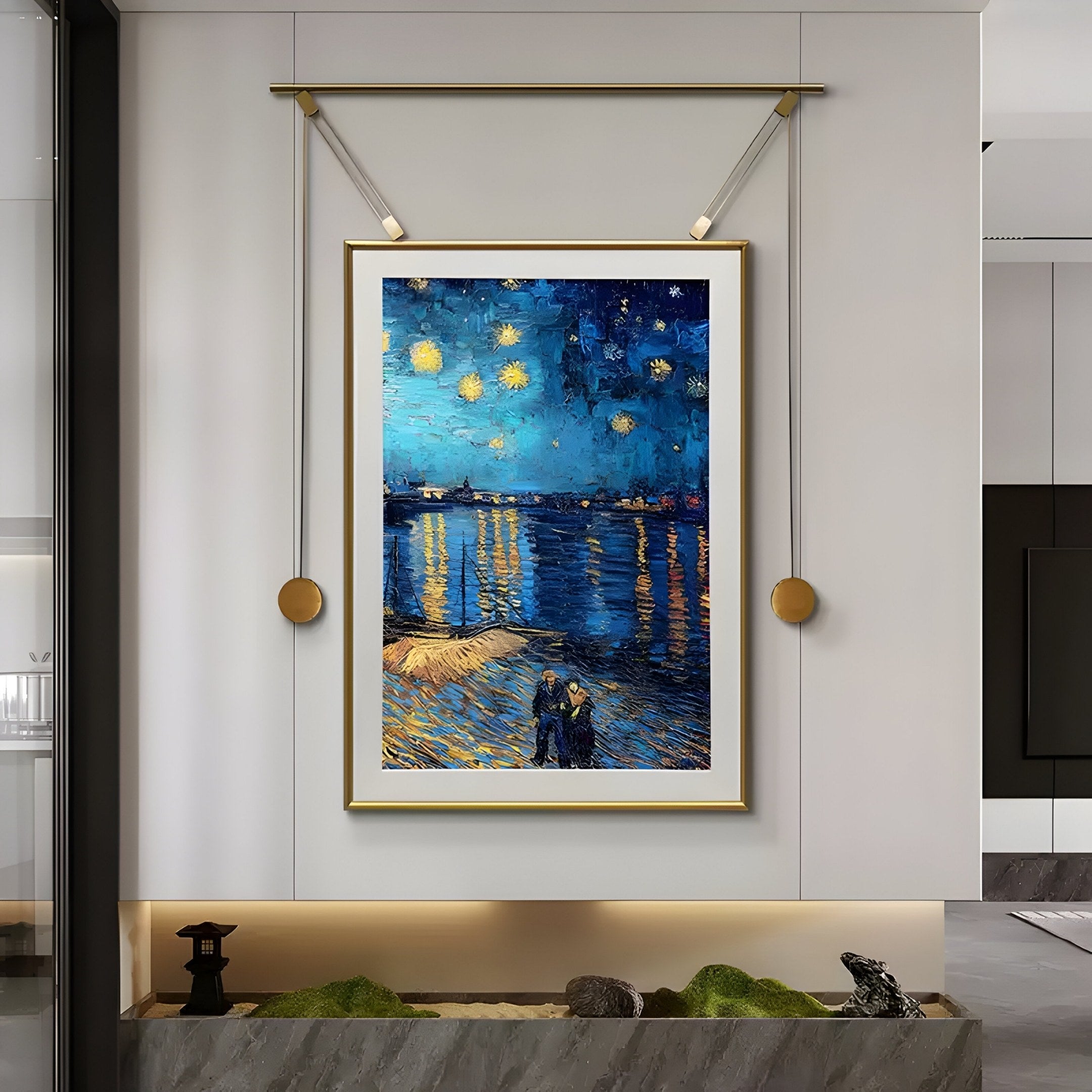 The Reverra Starry Night Over The Rhone Hanging Frame Wall Art captures the essence of a serene night sky, blending deep blues, gold, and soft reflections on a tranquil river. Its intricate brushwork and vivid colors create a dynamic and calming focal point. Suspended in a modern gold frame with delicate balancing weights, this piece adds an artistic statement to any interior while maintaining a clean, contemporary presentation.