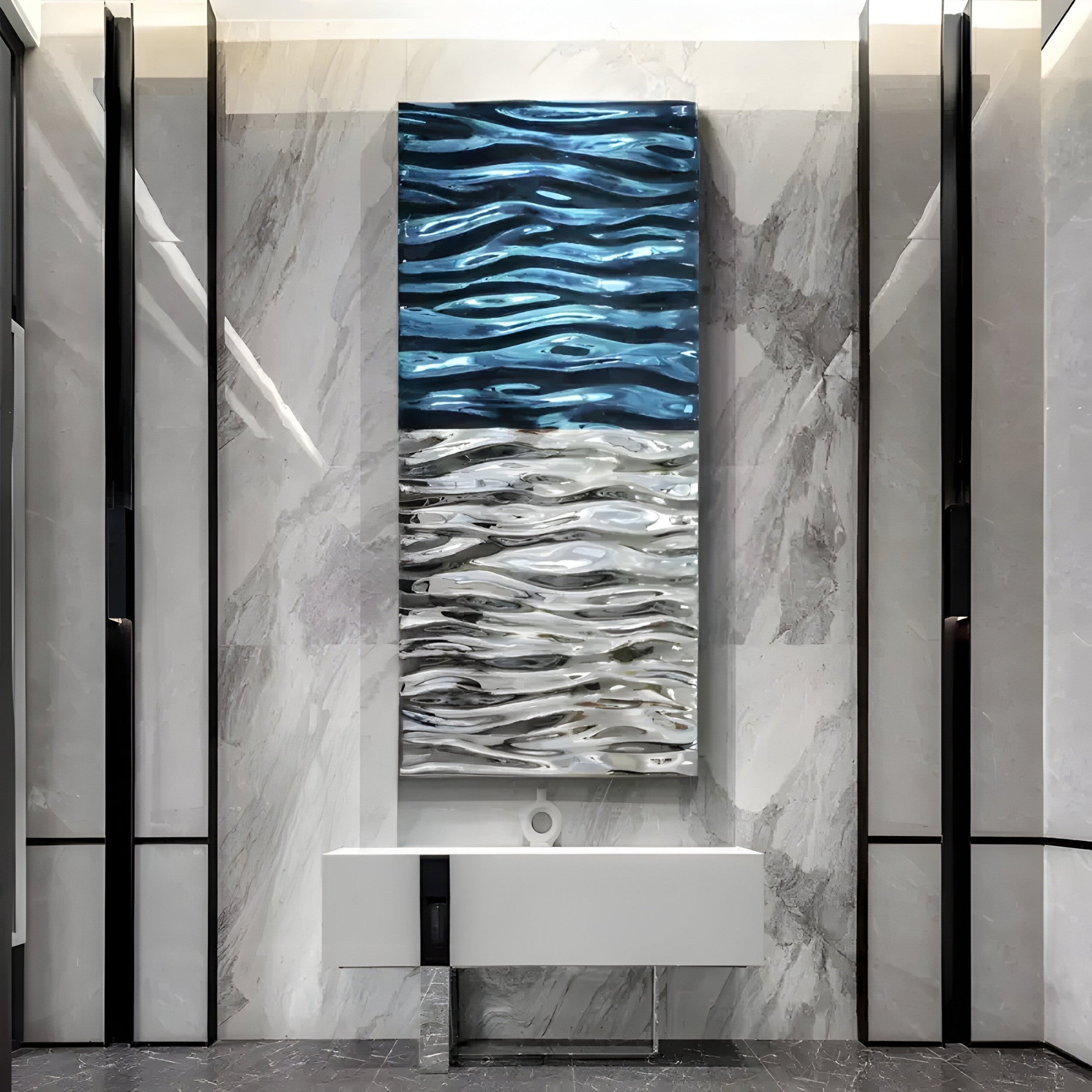 The Ripple Dual-Tone Chrome & Blue Textured Wall Art is a striking combination of metallic textures and contemporary elegance. Featuring a seamless blend of polished chrome and vivid blue tones, the design mimics the organic flow of rippling water, creating a dynamic visual effect. The stainless steel construction highlights durability while its glossy finish enhances light reflection, making it a standout piece in modern interiors. Whether mounted horizontally or vertically, this wall art introduces depth and sophistication to any space.