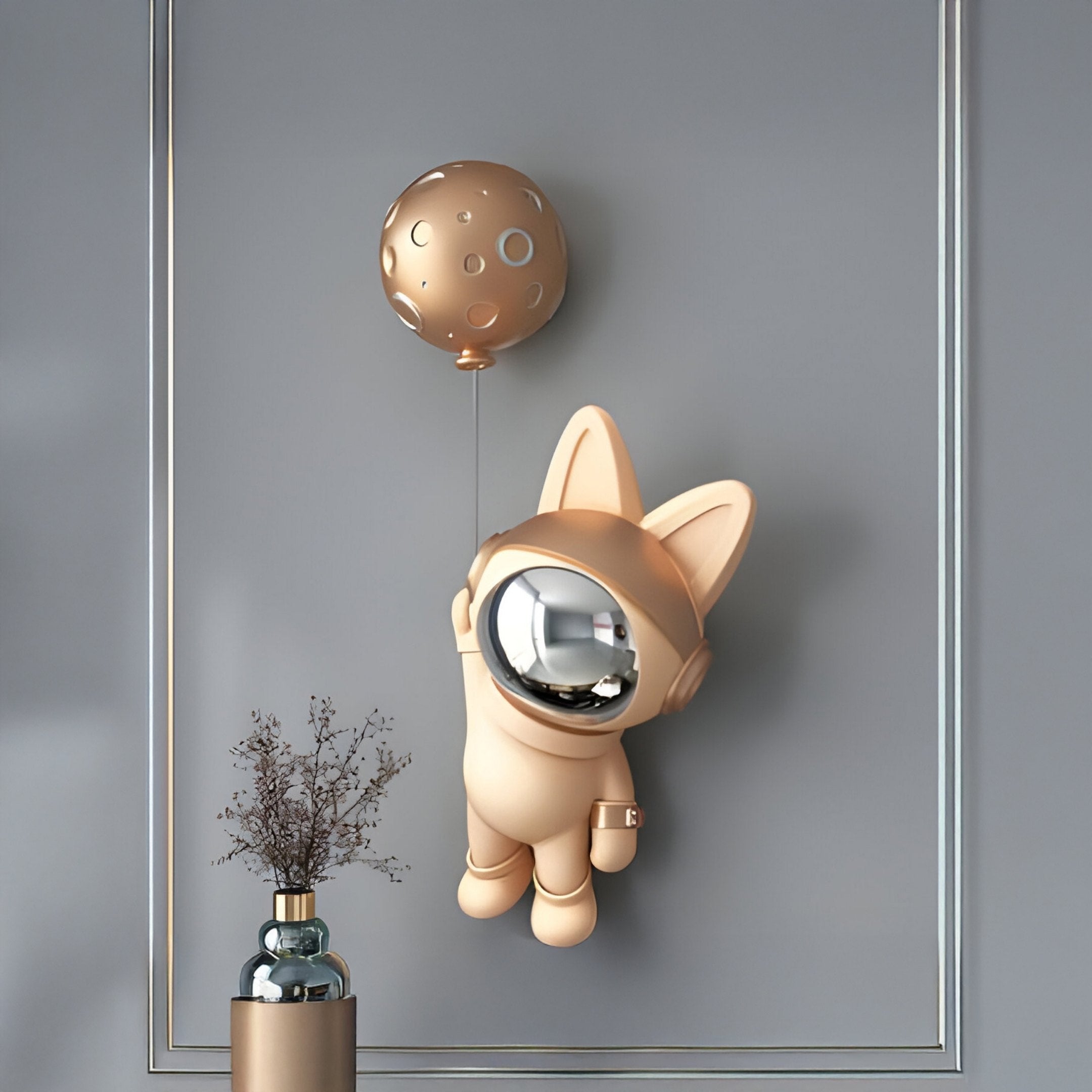 Add a playful cosmic element to your décor with the Rose Gold 3D Astronaut Bunny Balloon Wall Art, a resin sculpture that combines whimsical charm and a futuristic edge. The bunny’s rose gold suit catches the light with a gentle shine, while a reflective visor brings a modern touch to the design. Hovering above the bunny’s paw is a cratered, moon-like balloon, hinting at interplanetary adventures. Whether placed in a living room, bedroom, or creative workspace, this piece draws attention and sparks conversation. Its unified colour scheme pairs well with neutral or bold backdrops, making it an adaptable accent in various interior styles.