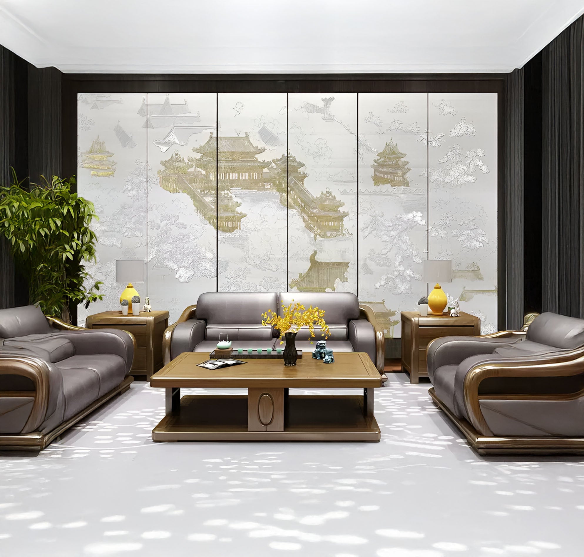 Perfectly suited for larger spaces, this multi-panel silk wall art transforms dining rooms, living areas, or executive offices into elegant sanctuaries. The neutral tones and luminous gold foil accents ensure it complements both contemporary and classic decor styles. The multi-panel format creates a sense of grandeur, making it ideal for expansive walls. The interplay of light with the 3D gold detailing enhances its dynamic presence, making it a captivating focal point in any setting. Used as a statement piece in a formal dining area or as a sophisticated addition to a luxury hotel lobby, this artwork blends versatility with timeless appeal.