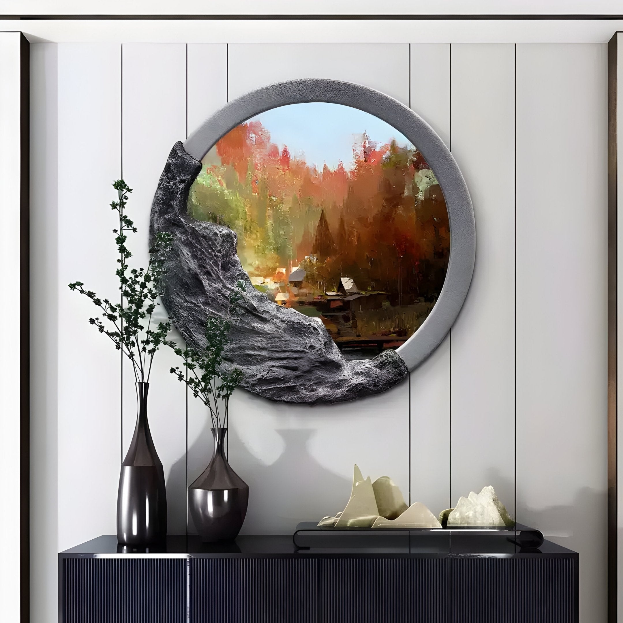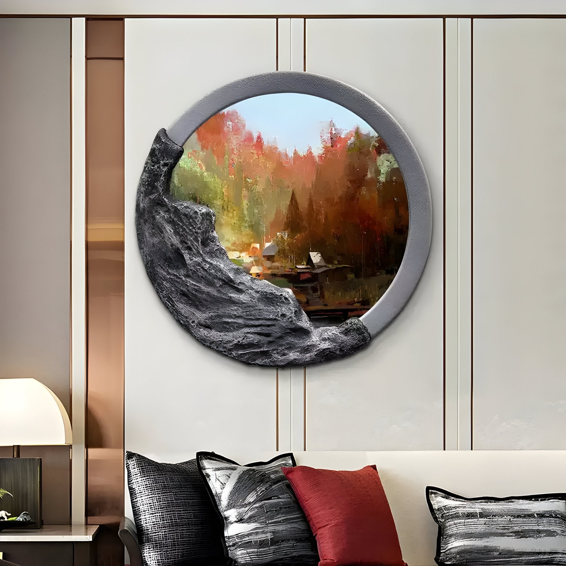 Thanks to its solid wood relief structure, this circular mural stands out as a functional yet decorative centrepiece that can complement modern or rustic-chic interiors. Closer inspection reveals the delicate brushstrokes that define individual leaves, while the layered carving lends a sculptural quality, making the artwork appear almost alive. The grey rock border highlights the painting’s contrast between stable earth and the radiant, changing hues of nature. Ideal for those who value a balance of realism and abstraction, the design seamlessly merges handcrafted authenticity with refined aesthetics. Whether paired with muted décor or more eclectic furnishings, the Sylvara Autumn Woods Hand-Painted Wood Relief 3D Wall Art serves as a timeless conversation starter, inviting you and your guests to immerse yourselves in the richness of autumn all year round.