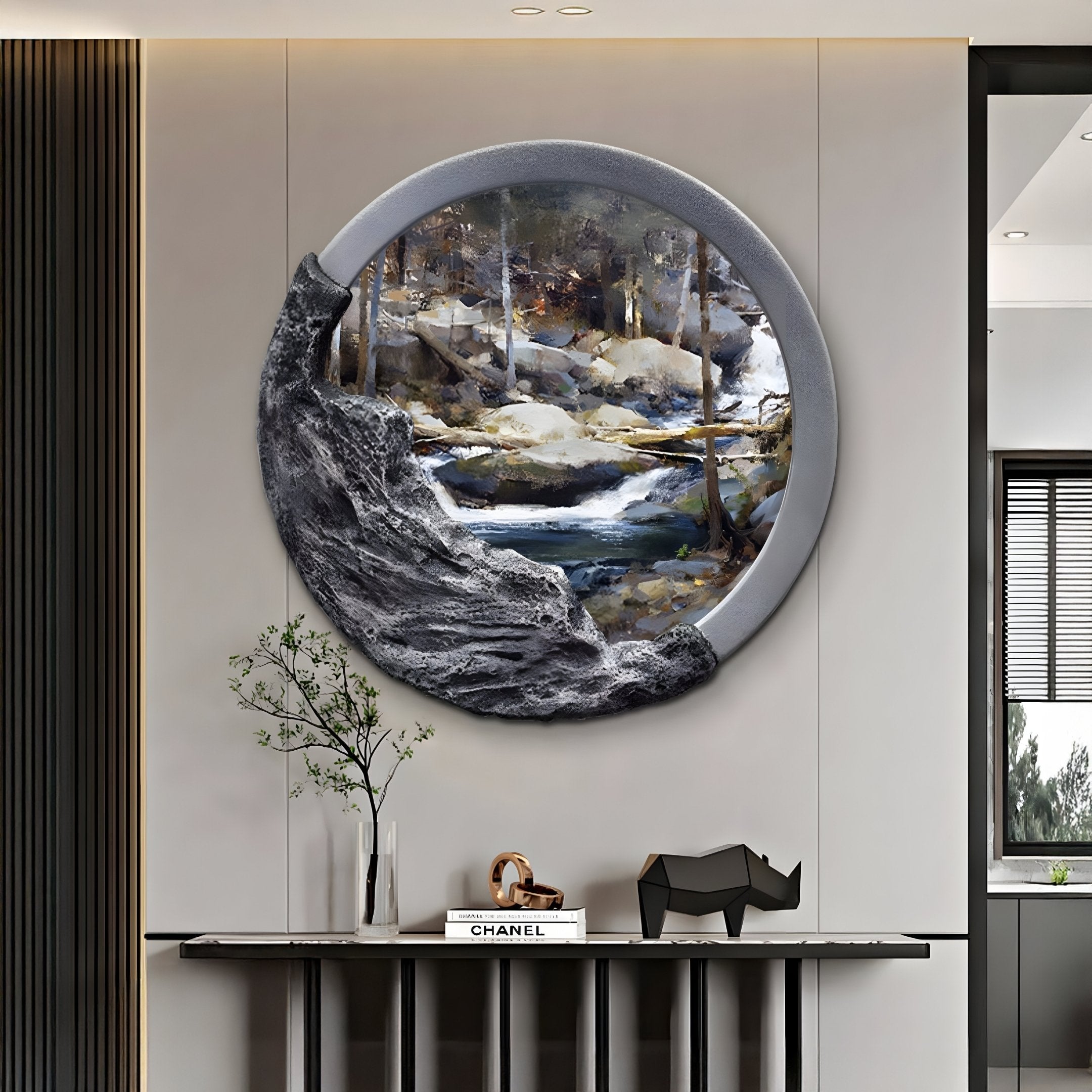 Thanks to its sturdy wooden foundation, the piece maintains a sense of stability that complements the flowing water motif. Subtle shading in the painted surface highlights rocky contours and flickers of sunlight dancing upon the stream. The circular form sets the work apart from conventional rectangular wall art, suggesting a seamless continuity of time and place. Perfect for minimalist interiors seeking a neutral focal point or cosier spaces longing for a touch of the outdoors, it effortlessly adapts to a range of décor styles. Whether showcased as a standalone accent or paired with complementary items, this relief exudes a refreshing simplicity. Crafted to endure everyday life while preserving its tranquil essence, the Sylvara Forest Stream Hand-Painted Wood Relief 3D Wall Art stands as a testament to the harmonious blend of artistry and nature.