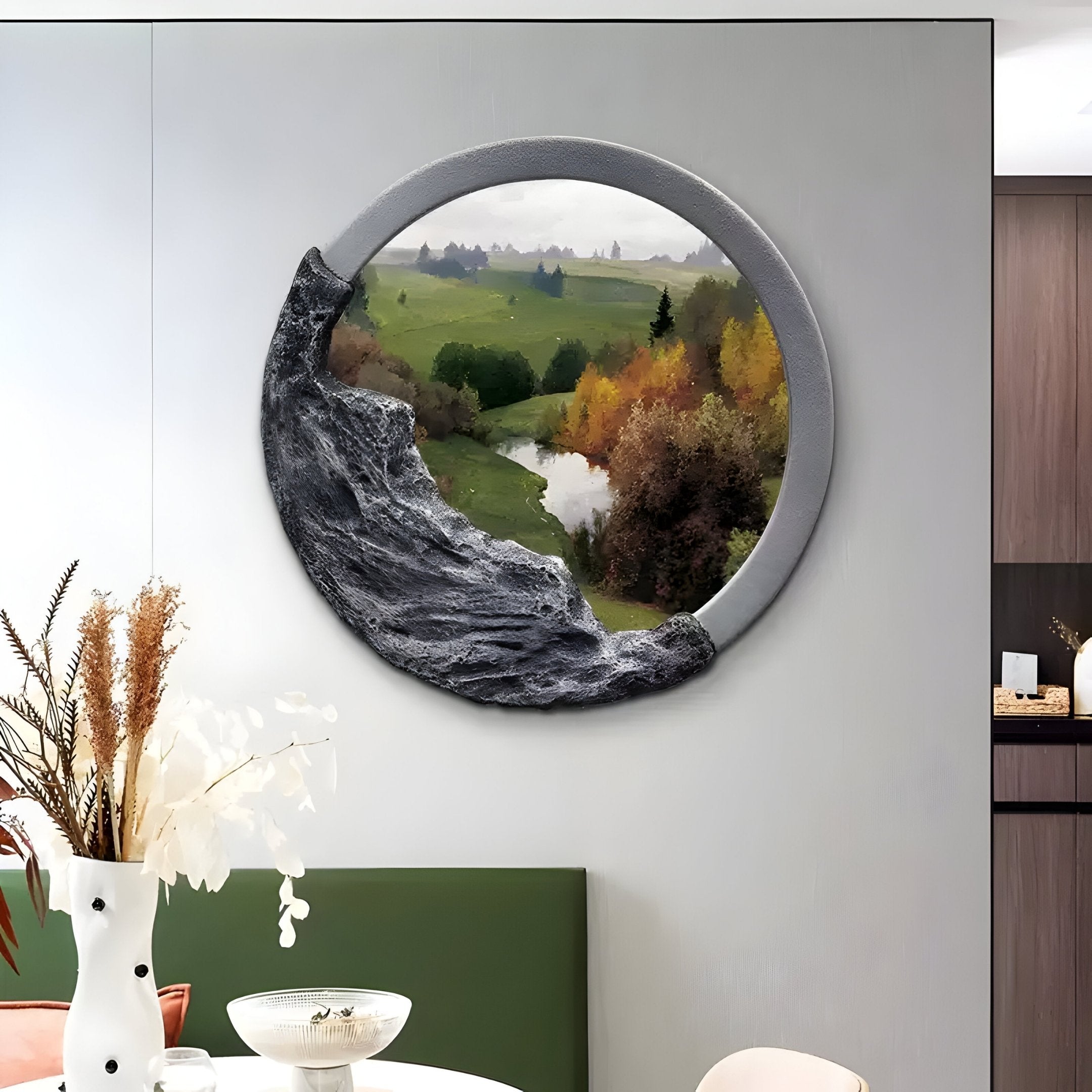 Carved from solid wood and meticulously hand-painted, the Sylvara Meadow Vista Hand-Painted Wood Relief 3D Wall Art captures a tranquil pastoral scene within a circular frame. The artwork presents a gentle landscape where a lush meadow unfolds beside a softly winding waterway, while the surrounding border is sculpted to resemble natural rock. The subtle interplay of hand-applied brushstrokes and carved contours creates a serene composition that evokes the quiet beauty of countryside vistas. The balanced colour palette, featuring calming greens, warm golds, and soft greys, ensures that this piece enhances both modern minimalism and more traditional settings. Its refined design makes it an ideal focal point for living rooms, hallways, or porch areas seeking a slice of nature-inspired tranquillity.