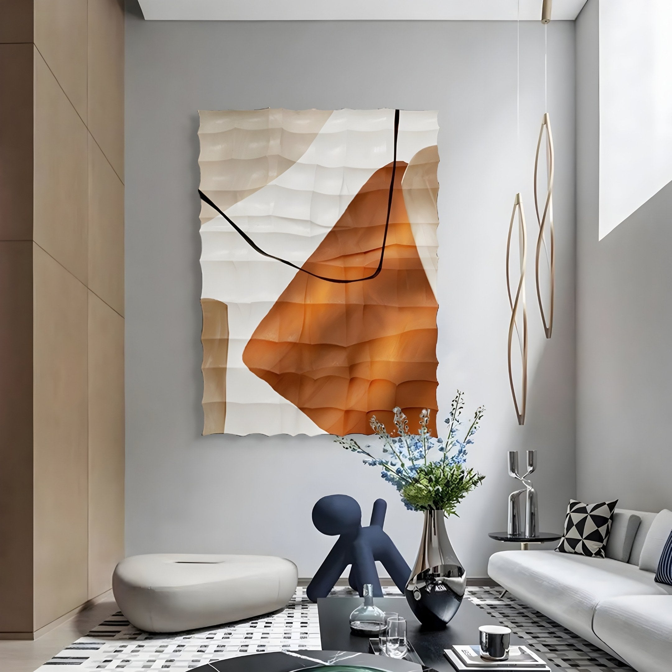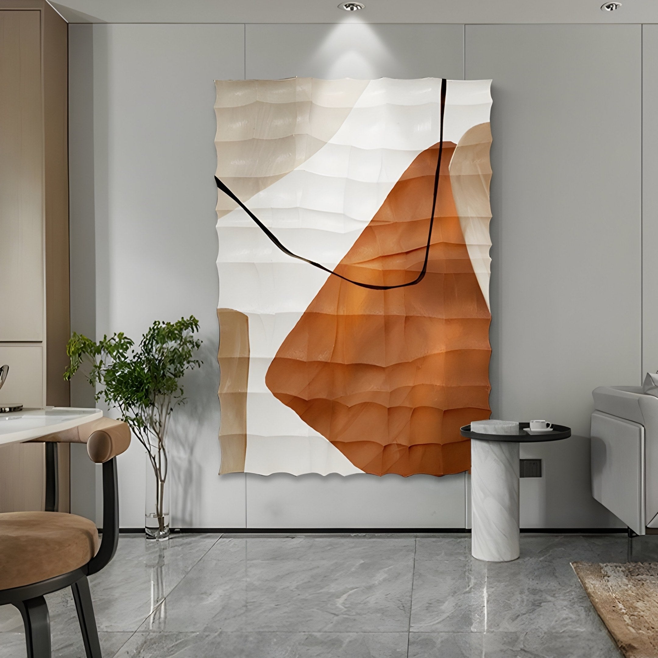Soft beige segments, bold terracotta forms, and a curving black line merge in the Terracurve III Hand-Painted Sandstone Wood Relief 3D Wall Art. Crafted from a solid wooden base and coated with a sandstone-like finish, this piece introduces a gentle ripple effect that plays with light and shadow. Each wave adds depth to the design, giving the impression of a desert-inspired landscape captured in a moment of calm. The hand-painted sections transition seamlessly between light and warm tones, while the dark line serves as a unifying element that guides the eye across the composition. A protective seal helps maintain the clarity of these hues, ensuring the artwork retains its inviting character over time.