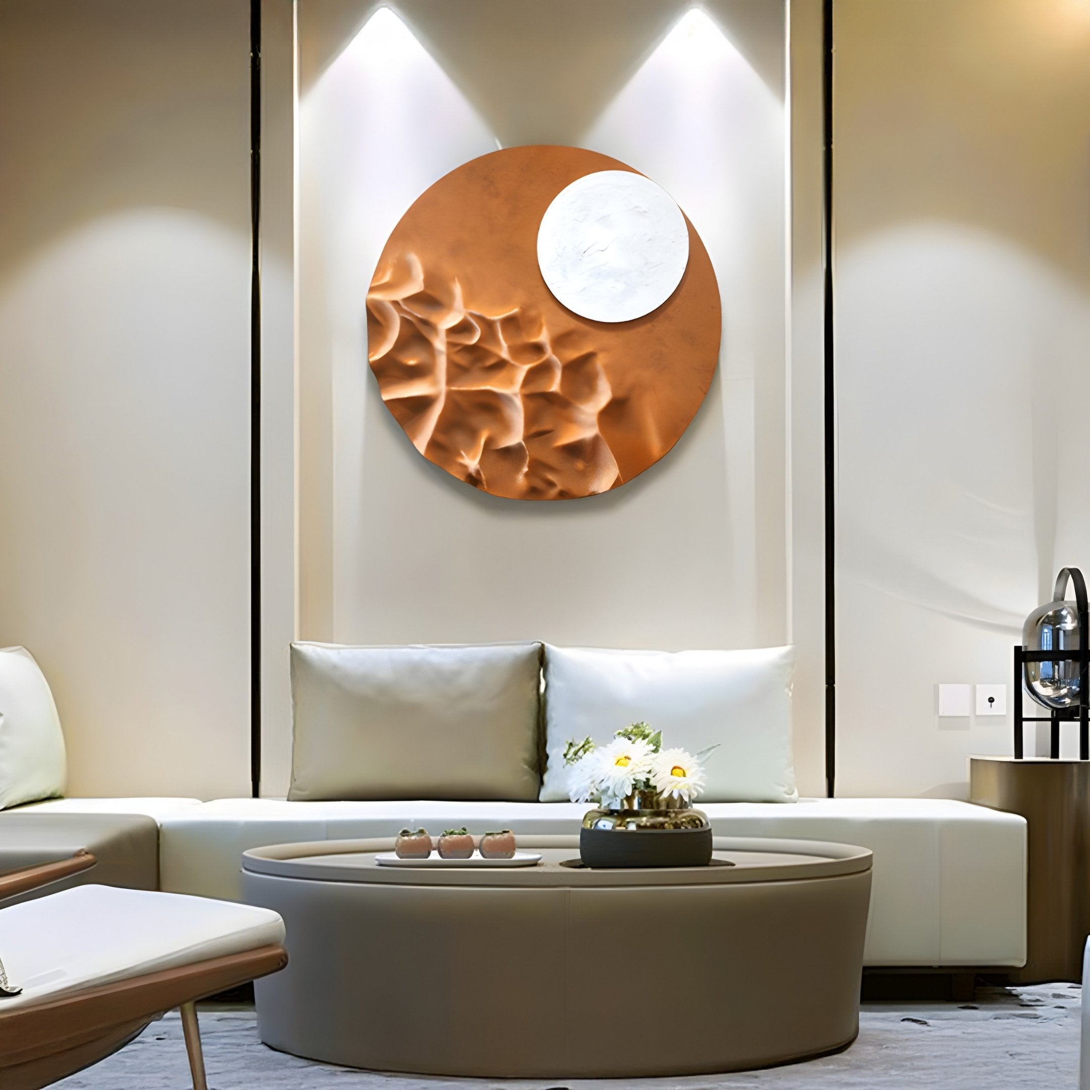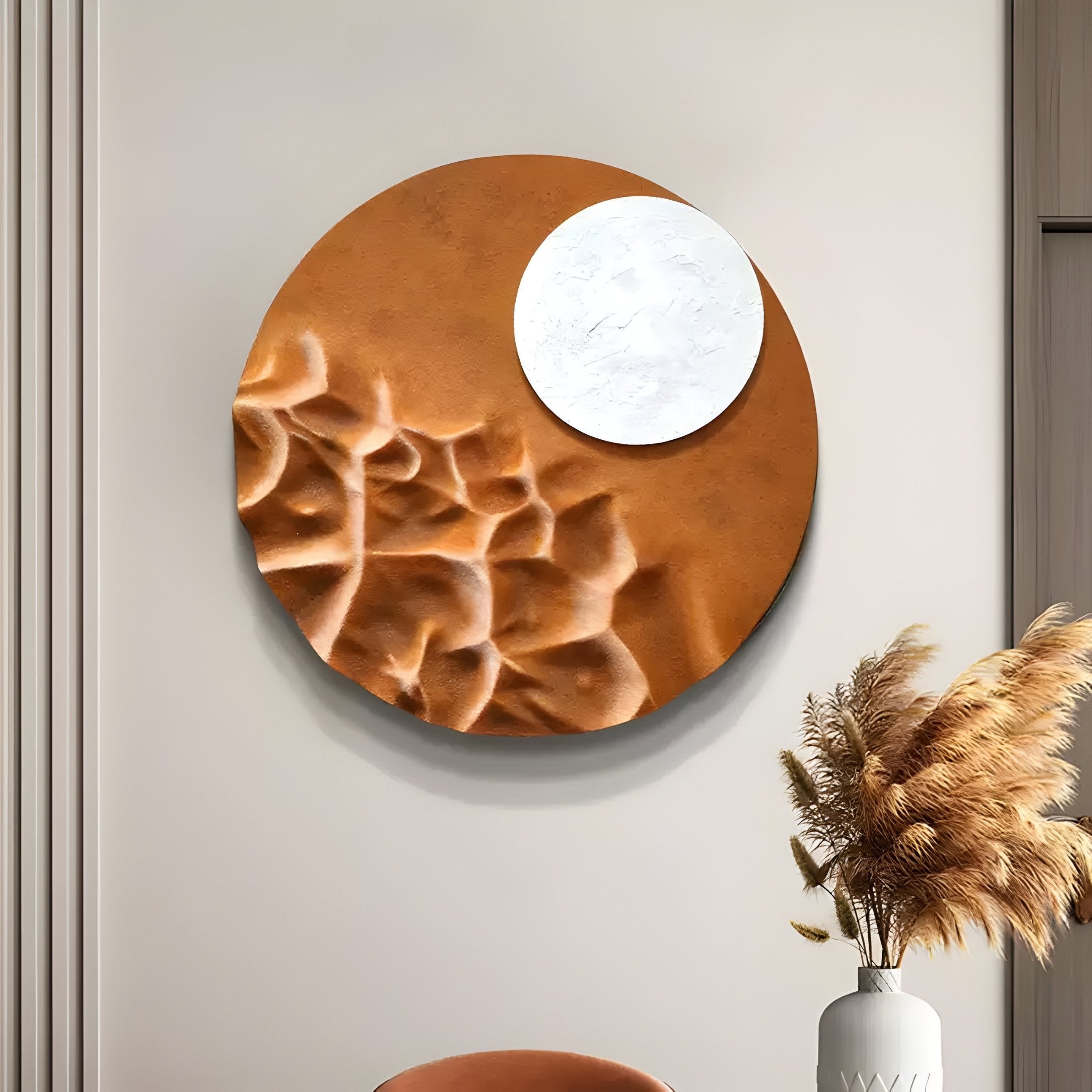 The Verve Earthy Brown Wood Relief 3D Wall Art showcases a beautifully carved circular form that instantly commands attention. Its warm, earthy brown finish accentuates the depth of the carved ridges, where light and shadow play together for a dynamic effect. A crisp white circular accent adds a subtle yet compelling contrast, drawing the eye toward the top of the piece. Each groove reflects skilled craftsmanship, turning ordinary wood into an artistic statement that merges modern design with a nod to nature. Whether observed from close up or from across the room, the sculpted surface reveals a refined complexity that lends character to your walls. It’s a testament to art’s ability to transform a simple material into something genuinely captivating.