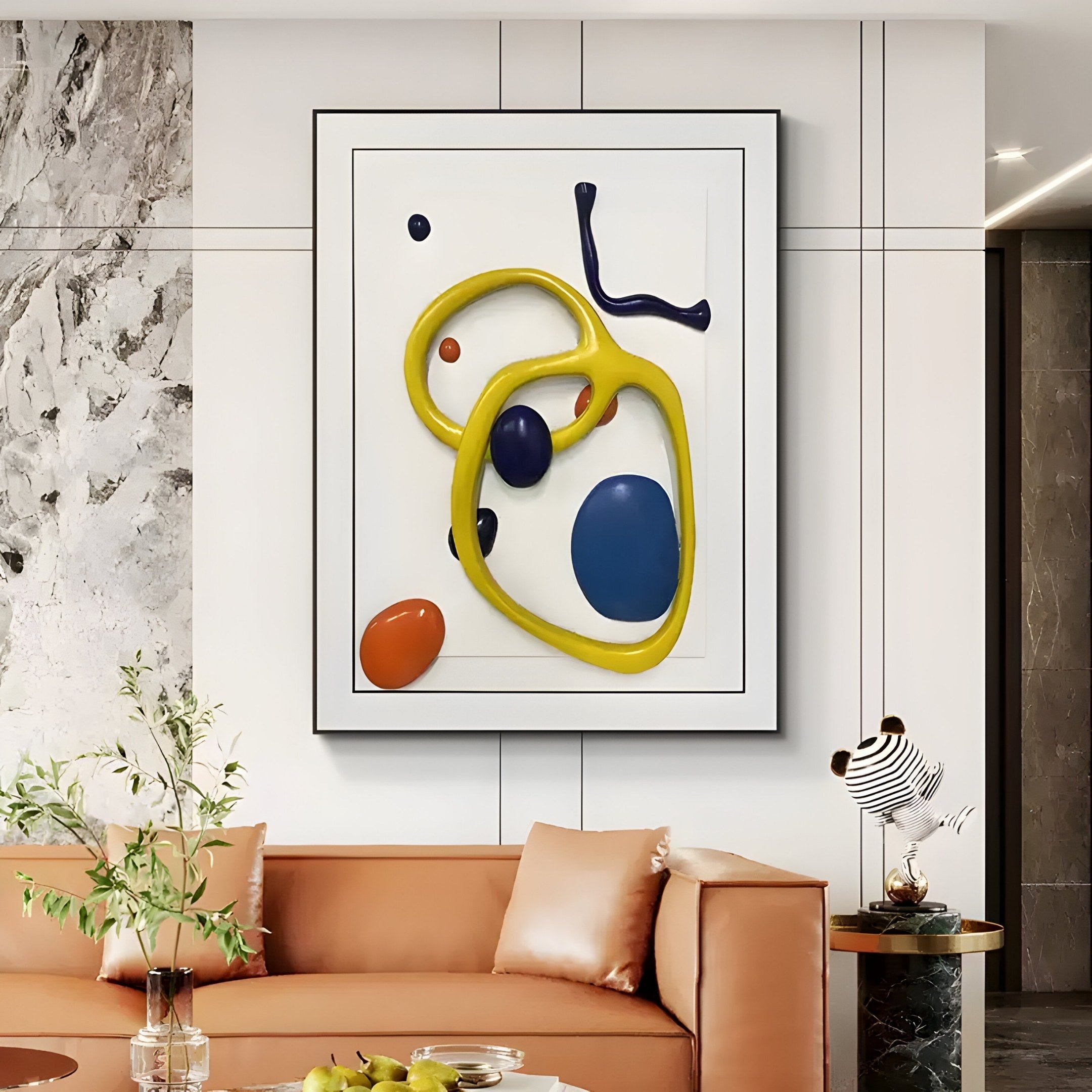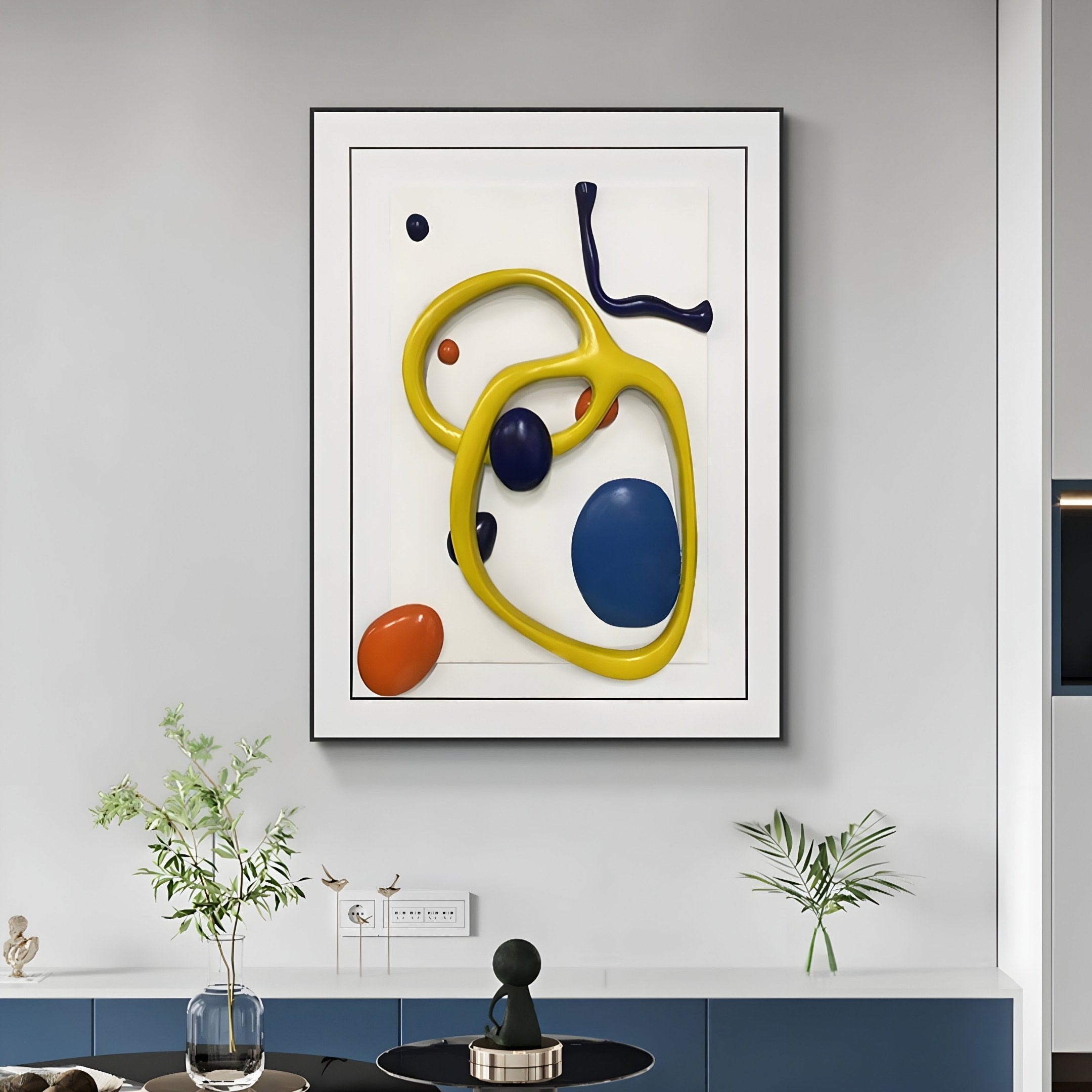 The Vitrus Yellow & Blue Abstract Wood Embossed 3D Wall Art infuses a burst of playful colour and depth into modern interiors. A solid wooden panel forms the foundation, while embossed leather elements add a tactile layer to the composition. Curving yellow lines loop around vivid blue and orange shapes, creating a striking contrast against the crisp white background. The use of both glossy and matte finishes enhances the artwork’s three-dimensional quality, as certain areas reflect light while others remain more subdued. Placed in a hallway, living room, or office space, this abstract design catches the eye without overwhelming the overall décor.