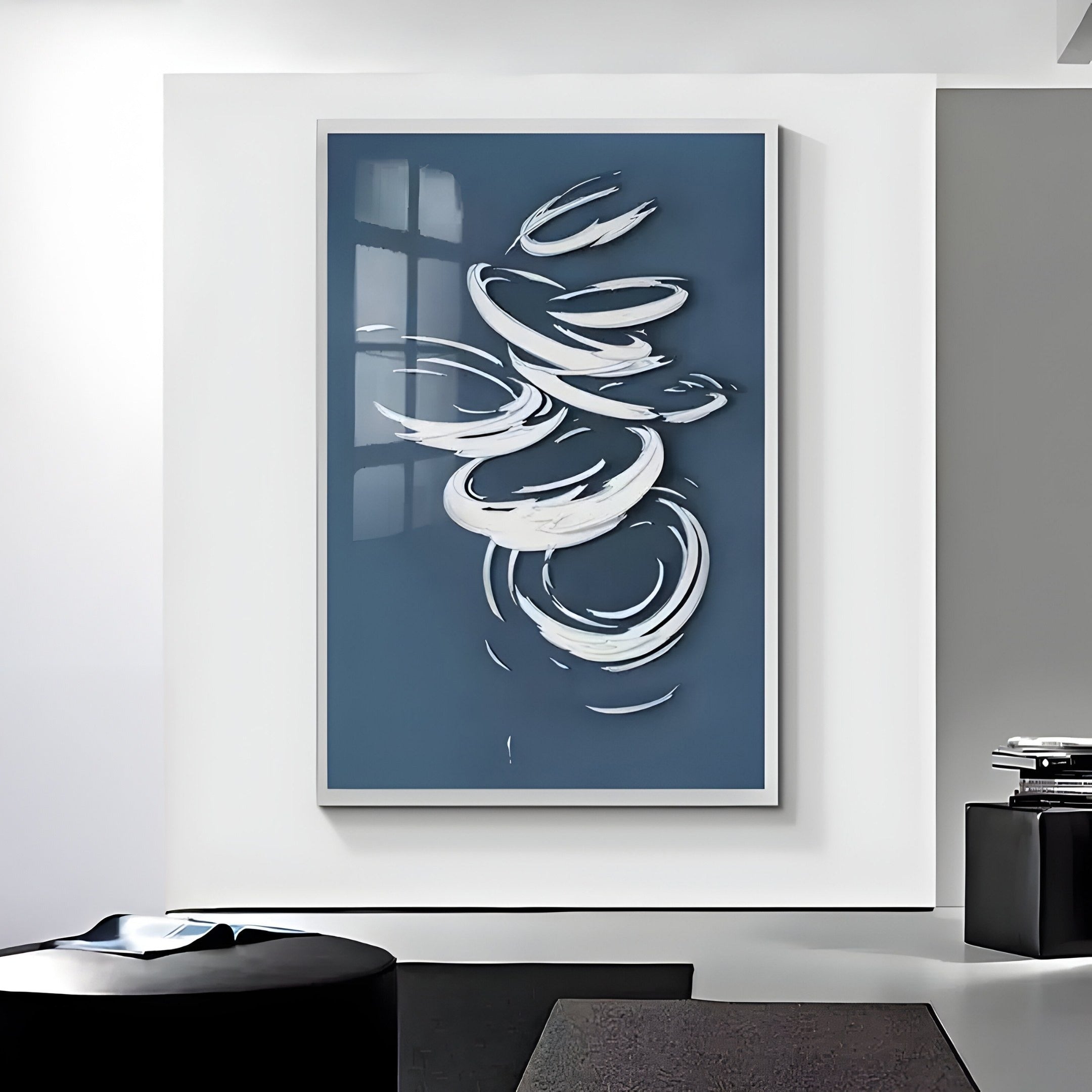 The Zephyr Azure Swirl Abstract Metal Wall Art blends minimalist design with artistic motion, offering a contemporary visual experience. Its deep azure backdrop serves as the perfect canvas for dynamic white swirls crafted from precision-sculpted iron. The layered swirls appear to float effortlessly within a sleek acrylic box, adding depth and dimension to the piece. This thoughtful combination of colour, texture, and material creates a three-dimensional effect that shifts beautifully with changing light. Durable yet refined, this art installation makes a lasting impression while maintaining a clean, modern aesthetic.