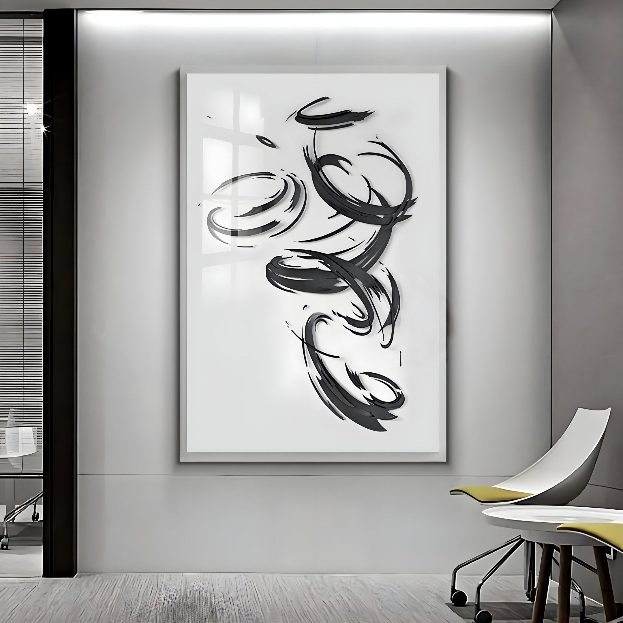 The Zephyr Monochrome Motion Abstract Metal Wall Art is a striking piece that blends modern design with artistic movement. This artwork features bold black swirls that appear suspended against a clean white backdrop, creating a dynamic and layered three-dimensional effect. The interplay between light and shadow on the iron-crafted swirls adds a sense of depth and motion, enhancing its visual appeal. Enclosed within a sleek acrylic frame, the design achieves a contemporary yet minimalist look, making it an ideal choice for both residential and commercial interiors.