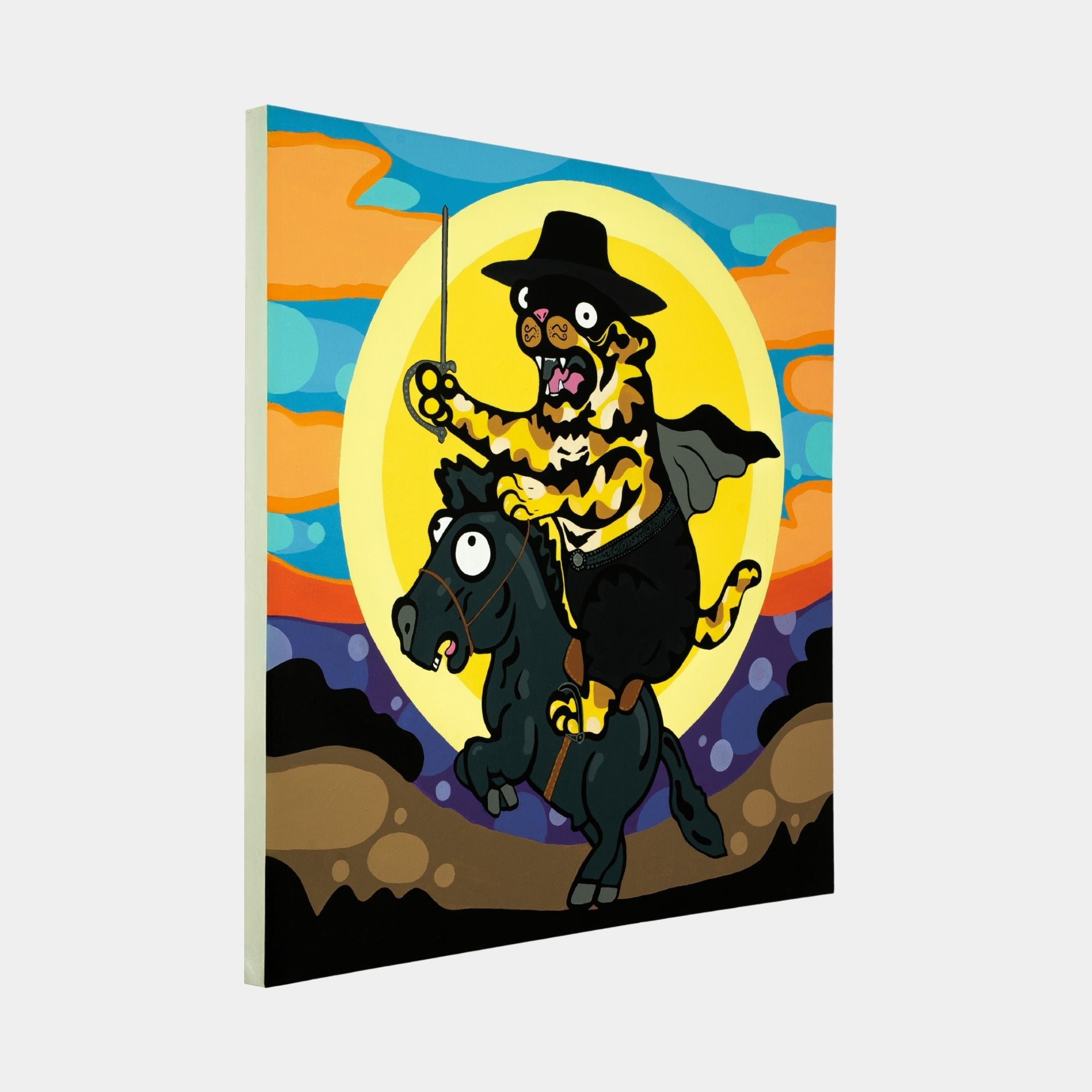 The Zorro Pop Art Canvas Painting brings together a lively blend of adventure and modern style. A spirited tiger, dressed in a flowing black cape and hat, rides a dark horse against a bold circular backdrop reminiscent of a glowing sun. Splashes of orange and purple in the surrounding sky add depth and energy to the composition. Painted in acrylic on a premium canvas, the piece showcases crisp outlines and vibrant contrasts, highlighting the tiger’s fearless expression and the horse’s determined stance. The pop art influence injects a playful twist into what might otherwise be a serious scene, capturing the daring aura of a swashbuckling figure while maintaining a sense of fun. Each brushstroke speaks to the artist’s commitment to quality, ensuring that this painting retains its vivid colours and distinct character for years to come.