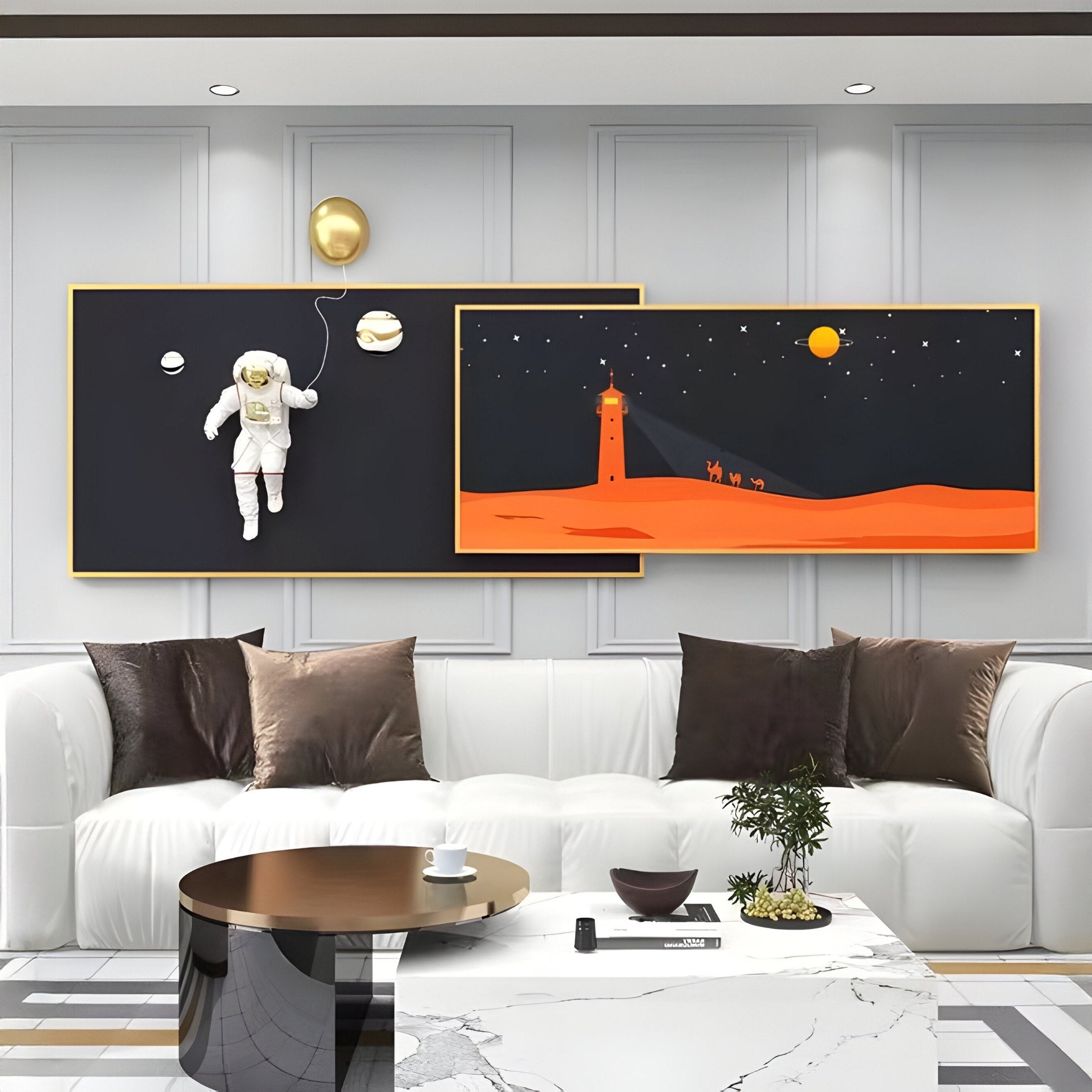 Introduce a dynamic blend of cosmic exploration and coastal mystique with the 3D Space Astronaut & Lighthouse Dual-Panel Rectangular Wall Art, a two-piece set that captures both the boundlessness of space and the grounding presence of a seaside beacon. On the left panel, a white-suited astronaut hovers amid a dark starry backdrop, accompanied by gold-and-white planetary spheres that hint at distant galaxies. On the right panel, a bold orange desert scene unfolds beneath a night sky dotted with stars, anchored by a tall lighthouse casting its guiding light. Together, these rectangular panels form a striking display that appeals to dreamers and décor enthusiasts seeking a unique statement.