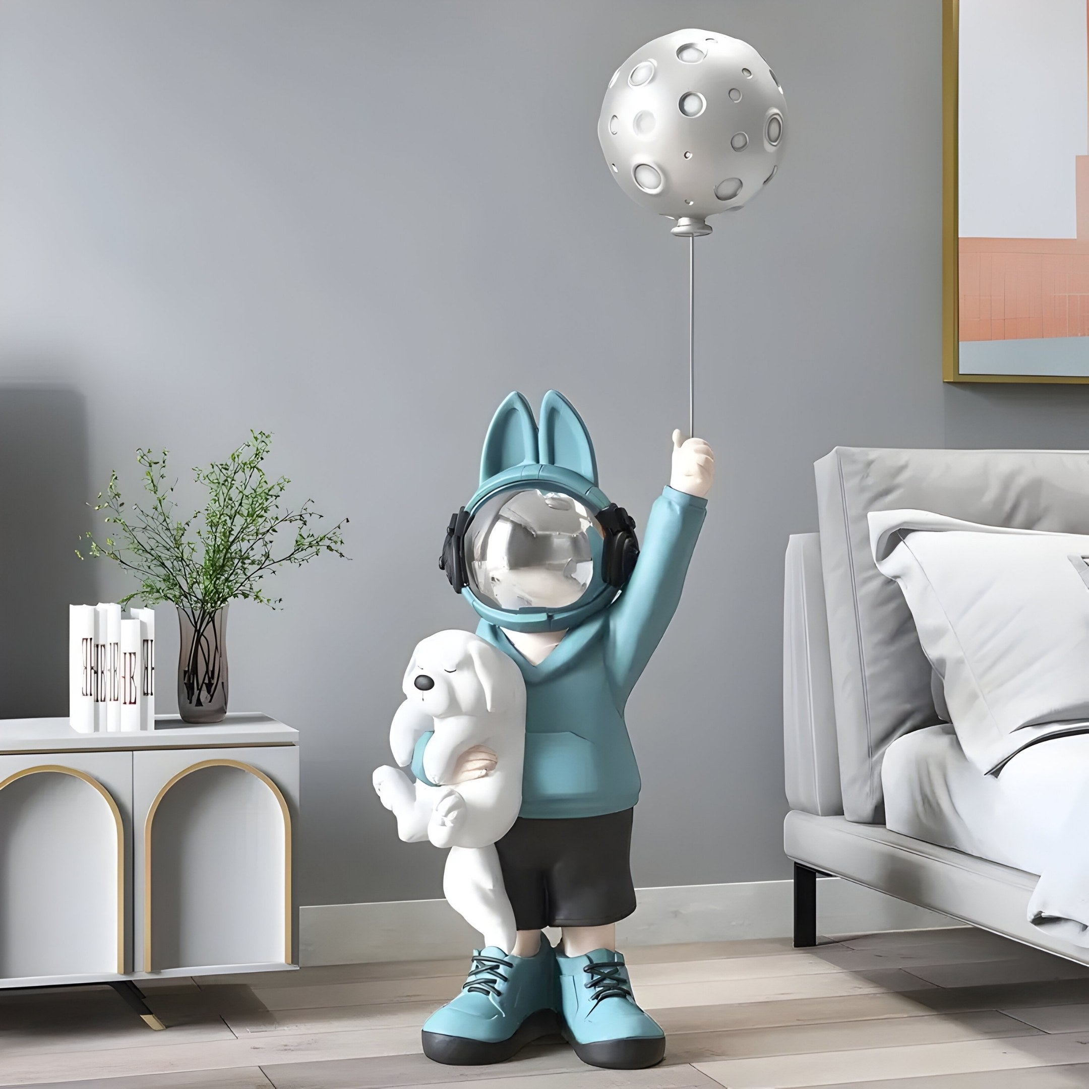 Add a friendly touch of fantasy to your interior with the Blue Astronaut Bunny Pup Balloon Sculpture at 130cm. Standing at an impressive height, this resin figure combines soft blue tones, playful bunny ears, and a crater-patterned balloon that appears to float overhead. The astronaut’s reflective visor gives it a futuristic edge, while black headphones and shorts create a balanced contrast. In one arm, a cuddly puppy figure adds a sense of warmth, resulting in a sculpture that feels both imaginative and comforting. Subtle details, like the smooth curves of the hoodie and neatly shaped boots, enhance its visual appeal without overwhelming the room. Whether you choose to place it in a lounge, bedroom, or creative workspace, the sculpture encourages onlookers to pause and appreciate its cheerful style.