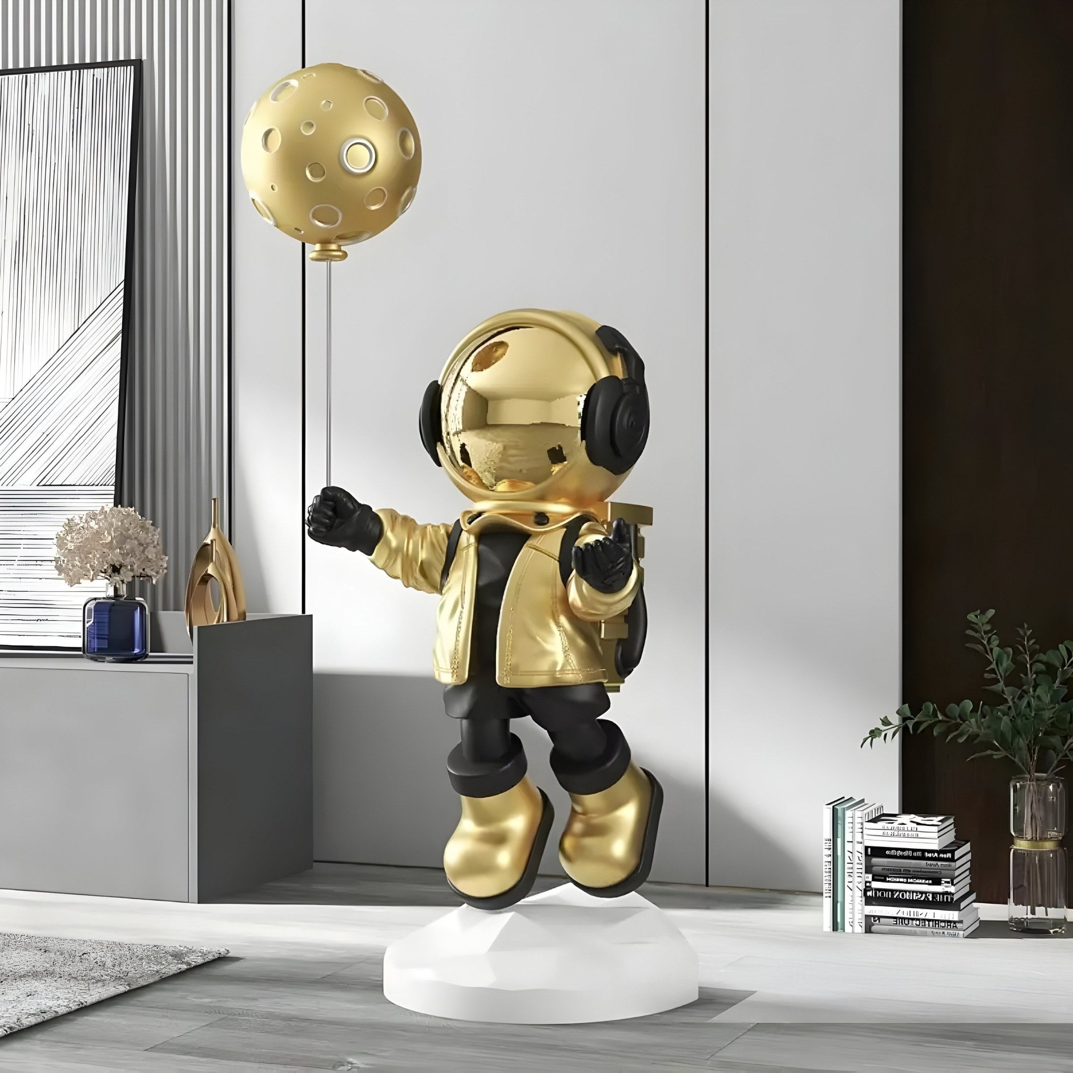 Suited primarily for indoor placement, the sculpture’s resin build ensures both durability and low maintenance, letting you appreciate its playful spirit over time. Positioning it near a window or under focused lighting enhances the visor’s mirrored sheen and the balloon’s crater details, introducing a subtle glow that draws the eye. If you already have space-themed ornaments or eclectic art, this astronaut can unify them under a shared celestial concept; otherwise, let it stand alone to prompt curiosity among guests. By merging a youthful silhouette with nods to lunar exploration, the Celestial Gold Astronaut Moon Balloon Sculpture reminds us that there’s always more to discover beyond everyday routines, offering a memorable focal point for those seeking a unique, conversation-worthy piece.