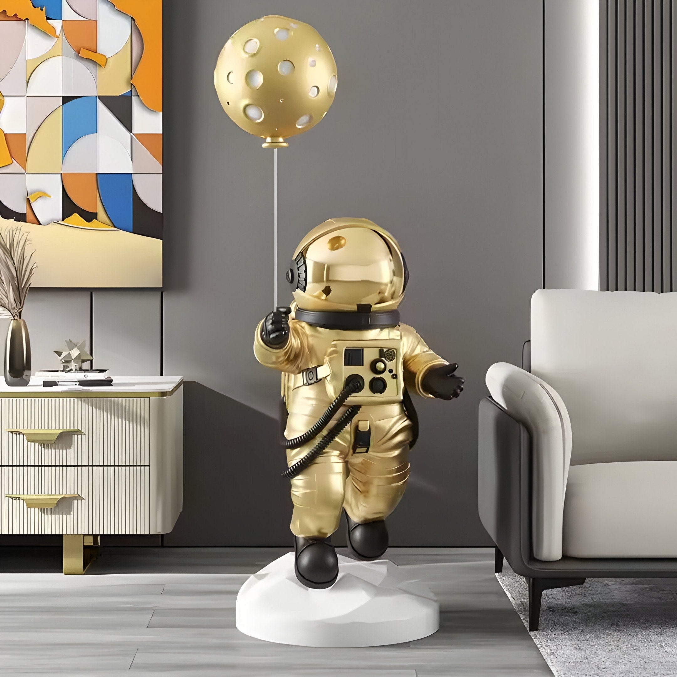 Add a cosmic highlight to your interior with the Celestial Gold Astronaut Ranger Balloon Sculpture measuring 120 cm in height. Crafted from resin with a luminous gold finish, this figure exudes futuristic flair while capturing the imagination. The astronaut’s suit features panel details, tubing, and a reflective visor that draws in ambient light, emphasising its adventurous theme. Held in one hand is a crater-pattern balloon, further enhancing the celestial vibe. Whether displayed in a stylish lounge, contemporary office, or creative studio, the sculpture commands attention without overwhelming the space.
