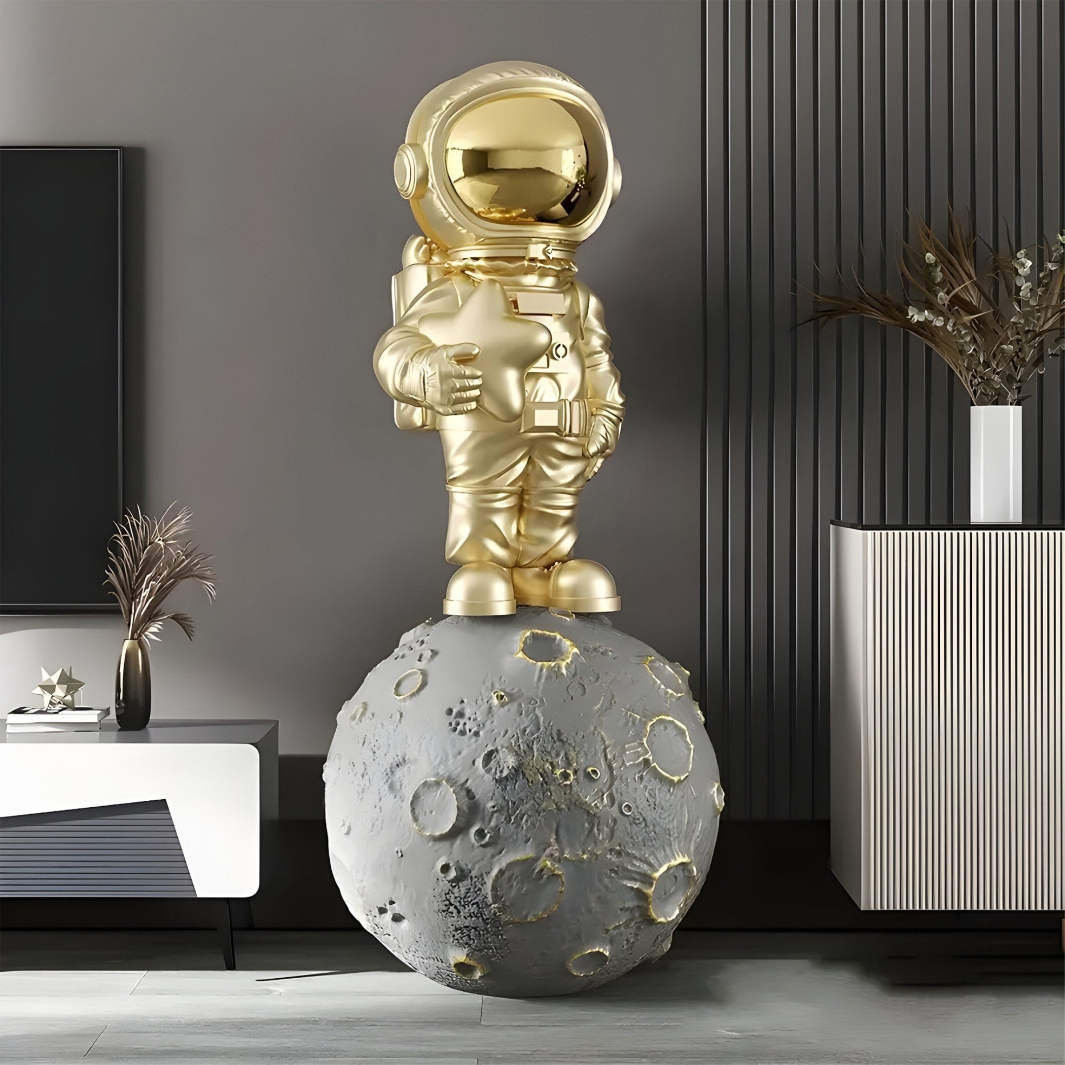 Designed for indoor use, the 125cm figure stands out in living rooms, offices, or spacious hallways. Placing it near a window or under accent lighting helps emphasise the astronaut’s metallic sheen and the Moon’s crater patterns. The resin construction ensures durability and ease of care, allowing you to appreciate its presence for years to come. If you already have cosmic-inspired artwork or ornaments, this piece can serve as a unifying centrepiece. Alternatively, let it stand on its own, capturing the attention of guests and reminding us of the infinite possibilities that lie beyond our everyday experiences. By merging a playful star motif with the grandeur of lunar exploration, the Celestial Gold Astronaut Star On Moon Sculpture reminds us that even the most distant dreams can be brought closer, lending a sense of wonder to any interior setting.