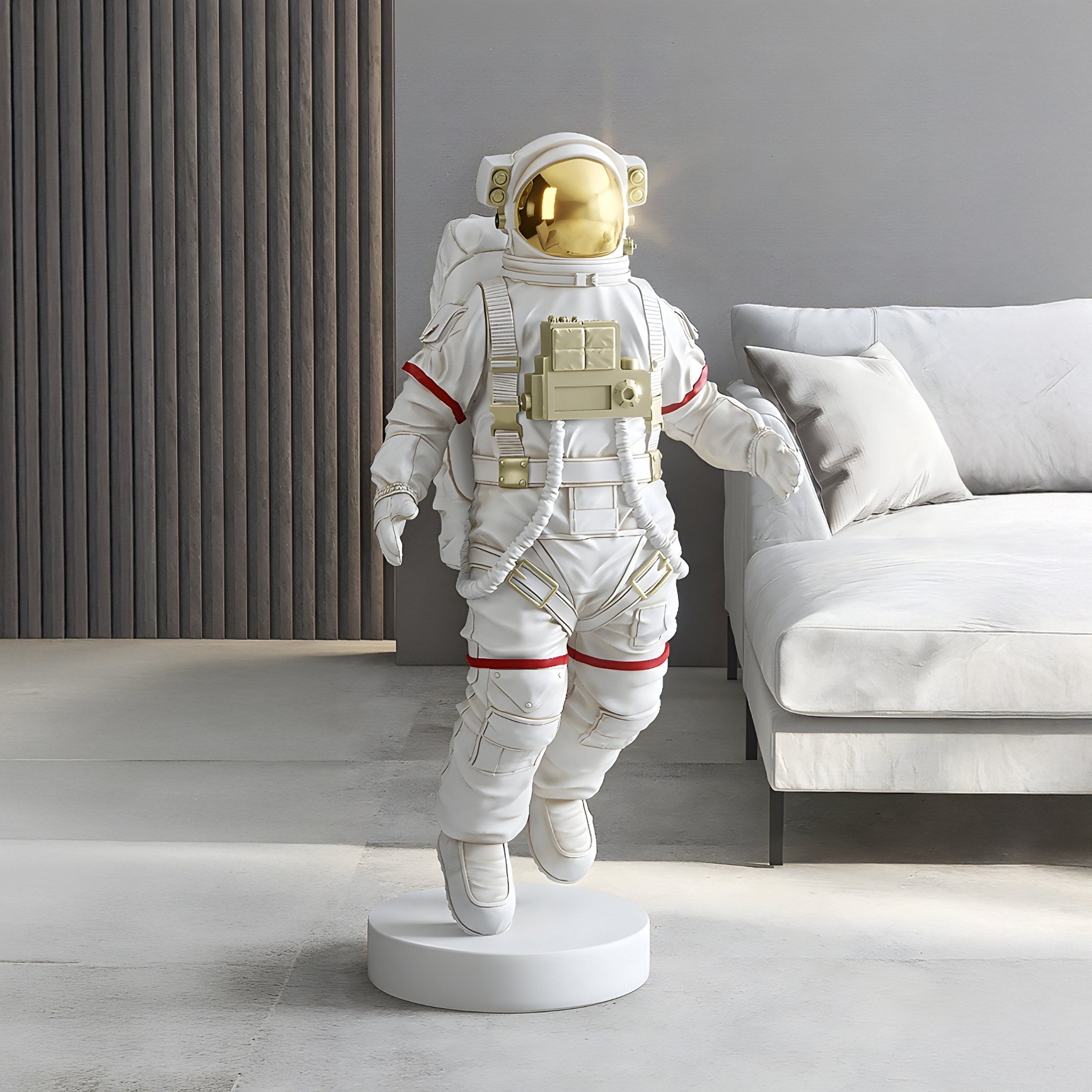 Invite a sense of cosmic discovery into your décor with the Cloud White Space Astronaut Voyager Sculpture, standing at 100cm. This resin figure captures the essence of space exploration through a crisp white suit, subtle red stripes, and a reflective gold visor that catches the light. The astronaut’s forward-leaning pose conveys motion, as though navigating low gravity or stepping onto an uncharted planet. Every detail, from the finely contoured boots to the neatly modelled backpack, underscores a careful approach to design. Whether you’re an enthusiast of space-inspired ornaments or simply want a statement piece that sparks conversation, this sculpture offers a memorable focal point.