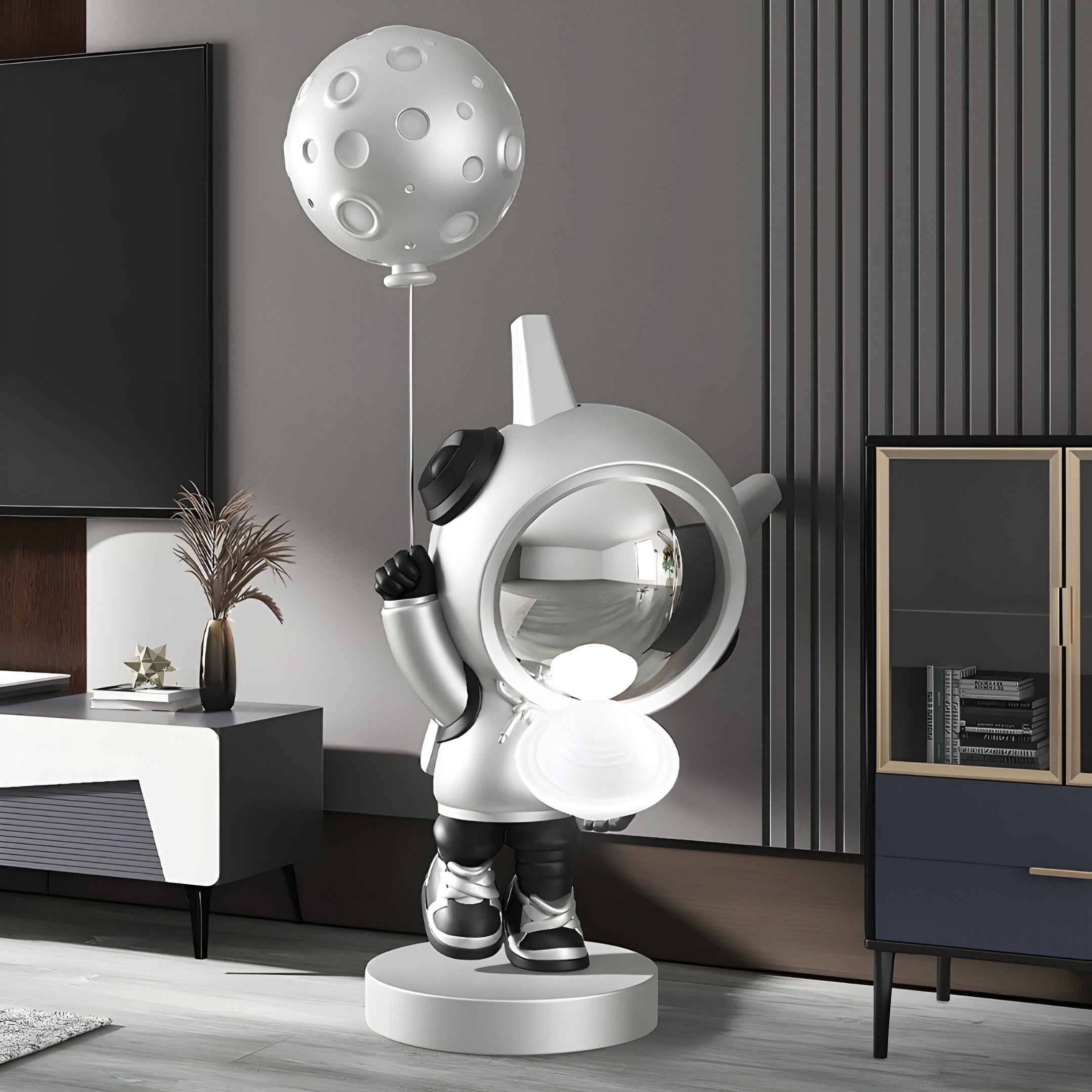 Introduce a dash of futuristic charm to your interior with the Cosmic Chrome Astronaut DJ Moon Balloon Sculpture at height 100cm. This resin figure portrays a bunny-eared astronaut wearing black headphones, all while clutching a balloon styled like a mini lunar sphere. A reflective visor takes centre stage on the helmet, adding a metallic shine that catches the light and draws the eye. From the boots to the small details around the torso, each element contributes to a design that fuses cosmic exploration with a playful nod to DJ culture. Whether you’re furnishing a lounge, a game room, or a stylish office corner, this piece adds a conversation starter that hints at the boundless creativity of outer space.