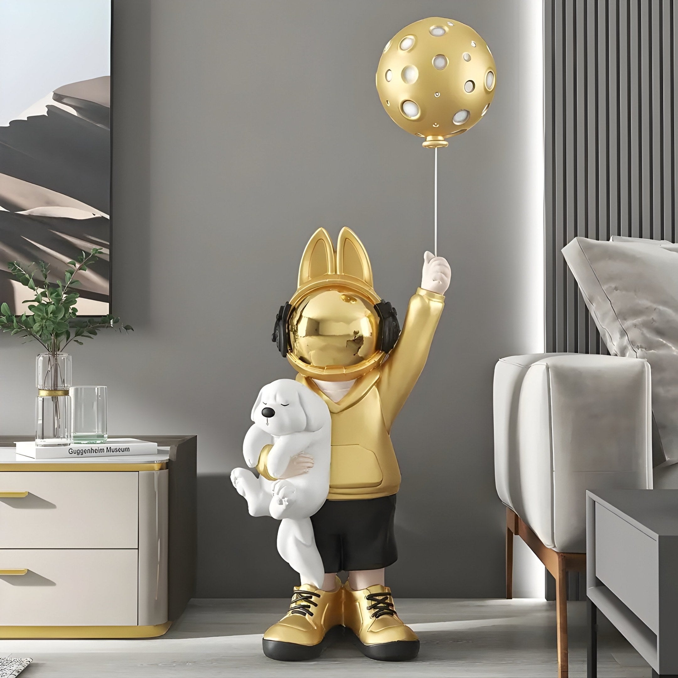 Thanks to its solid base and robust materials, maintenance remains straightforward, an occasional wipe should keep it in top form. The varied textures and finishes, from the bunny hoodie to the glossy gold footwear, encourage a closer look, making it an easy conversation starter. Measuring 130cm, the sculpture has an impressive presence yet maintains an approachable, light-hearted character. Its size allows the piece to fill a corner or stand beside furniture as a unique companion. For those who like to celebrate a sense of wonder in their décor, this design pairs the futuristic with the comforting to create something genuinely memorable. The Gold Astronaut Bunny Pup Balloon Sculpture reminds us that décor can be both engaging and uplifting, helping transform an ordinary room into a place of curiosity and delight.