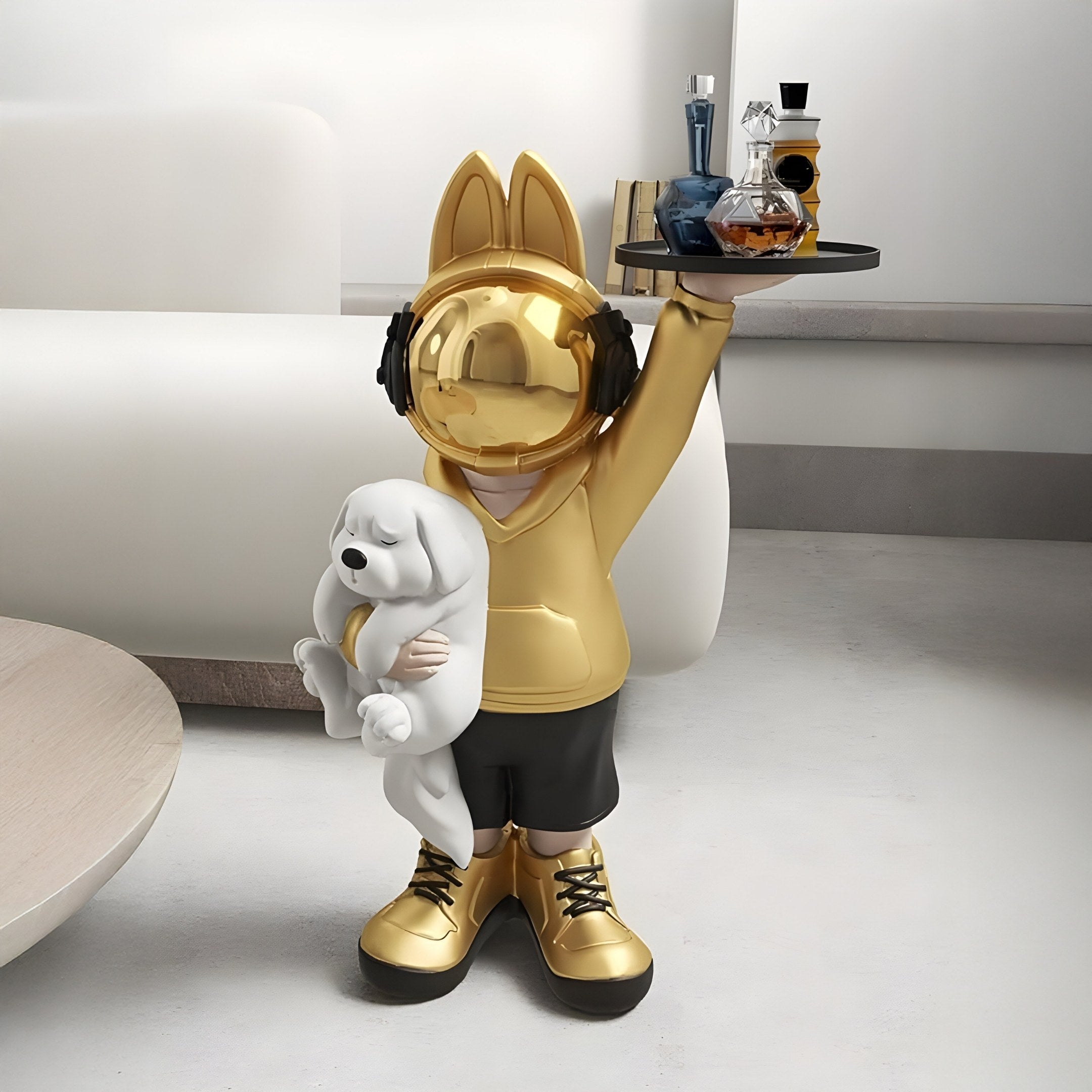 Bring a playful yet futuristic element to your interior with the Gold Astronaut Bunny Pup Butler Sculpture, standing 80 cm tall. This resin figure features a golden hood adorned with upright bunny ears and a reflective visor that adds a cosmic twist. A relaxed pup is tucked gently under one arm, while the other arm supports a circular tray that can hold your keys, small accessories, or even a few treats. Black shorts and headphones create a vivid contrast against the gold finish, ensuring the figure draws attention wherever it is placed. Crafted with smooth surfaces and thoughtful details, it offers a balanced blend of whimsy and usefulness.