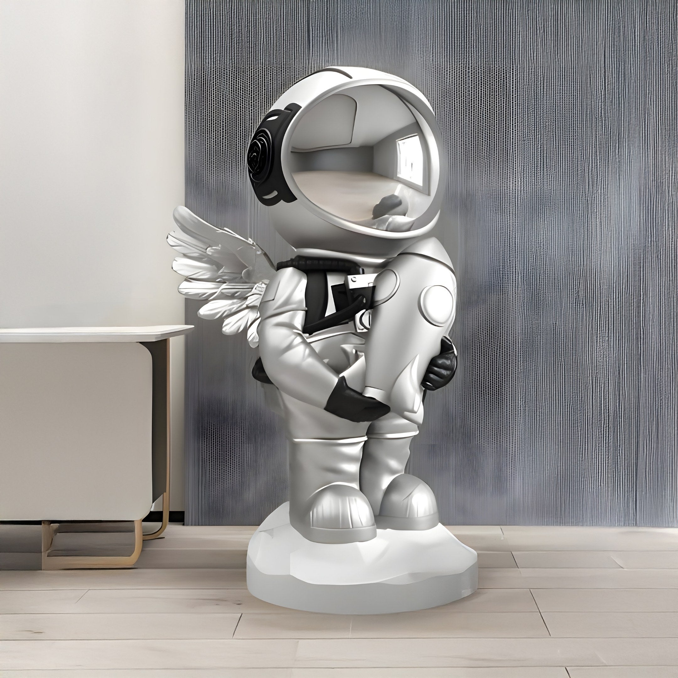 Position this sculpture near a window or beneath accent lighting to draw attention to the wings’ subtle curves and the rocket’s refined details. The astronaut’s boots, gloves, and panel lines nod to practical space gear, while the wings suggest a touch of fantasy and optimism. Standing at 75 cm, it has enough height to capture interest while remaining easy to place in rooms of different sizes. A stable base keeps it secure, and the reflective visor adds a dash of futuristic style. By blending celestial motifs with a hint of whimsy, this piece bridges the gap between the everyday and the extraordinary, prompting viewers to imagine infinite possibilities. From modern apartments to cosy family homes, the Lunar Silver Astronaut Angel Rocket Sculpture brings an uplifting aura that enlivens any interior.