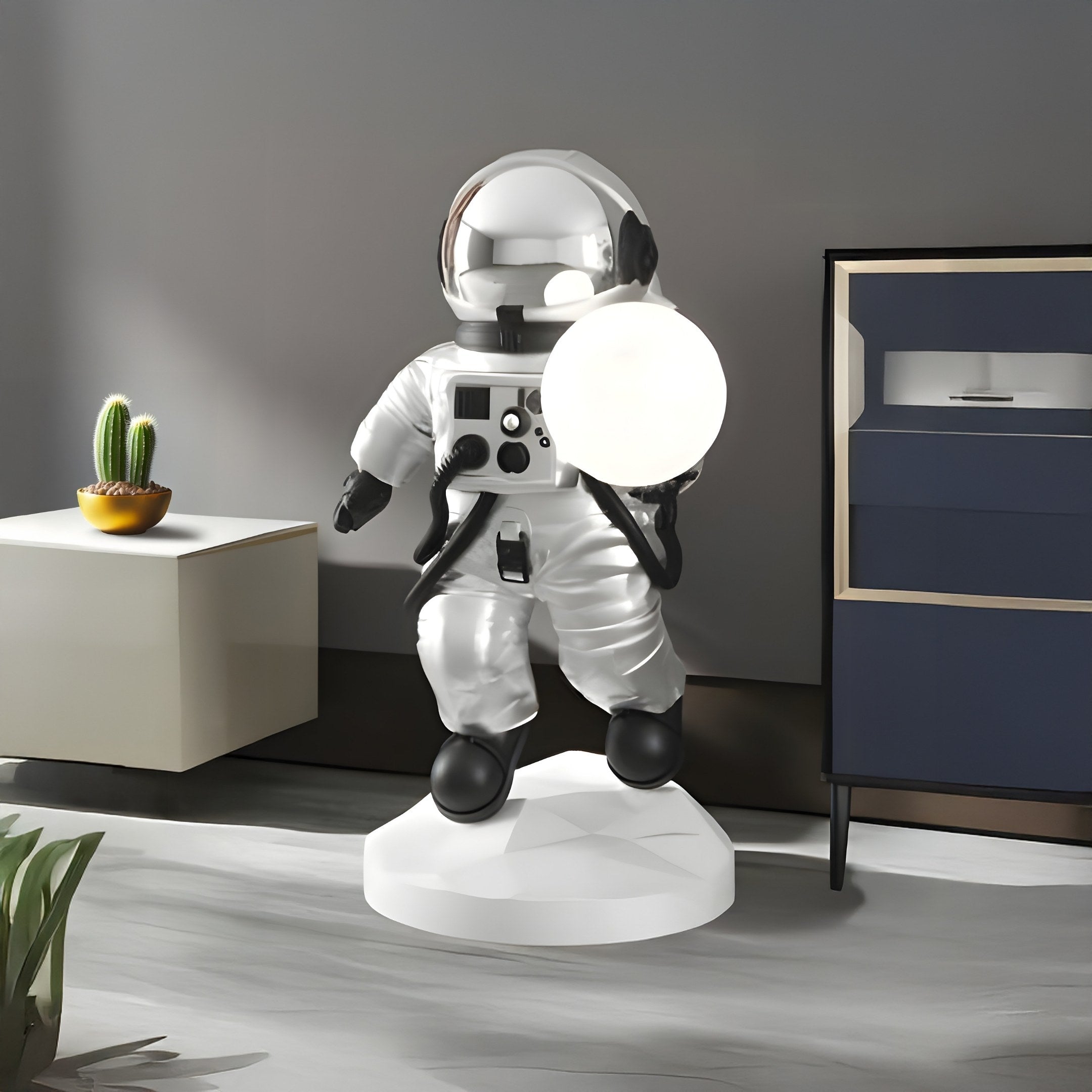 Position this 80cm figure in a living room, bedroom, or hallway to infuse your space with imaginative flair. Its tap-to-change feature allows you to effortlessly cycle through four vibrant hues, perfect for setting a relaxed ambience or adding a playful element during social gatherings. Thanks to the stable base and sturdy construction, you can display the sculpture on the floor or a low table with confidence. The orb’s soft glow can serve as a gentle nightlight, while the astronaut’s reflective design draws the eye during daytime hours. With USB charging, it remains convenient to maintain, allowing you to keep the orb illuminated whenever you wish. Whether you pair it with minimalist furnishings or include it in a collection of themed pieces, the Lunar Silver Astronaut Ranger Glow Orb Sculpture stands out as both a conversation starter and a functional source of light, bringing cosmic wonder into your everyday life.