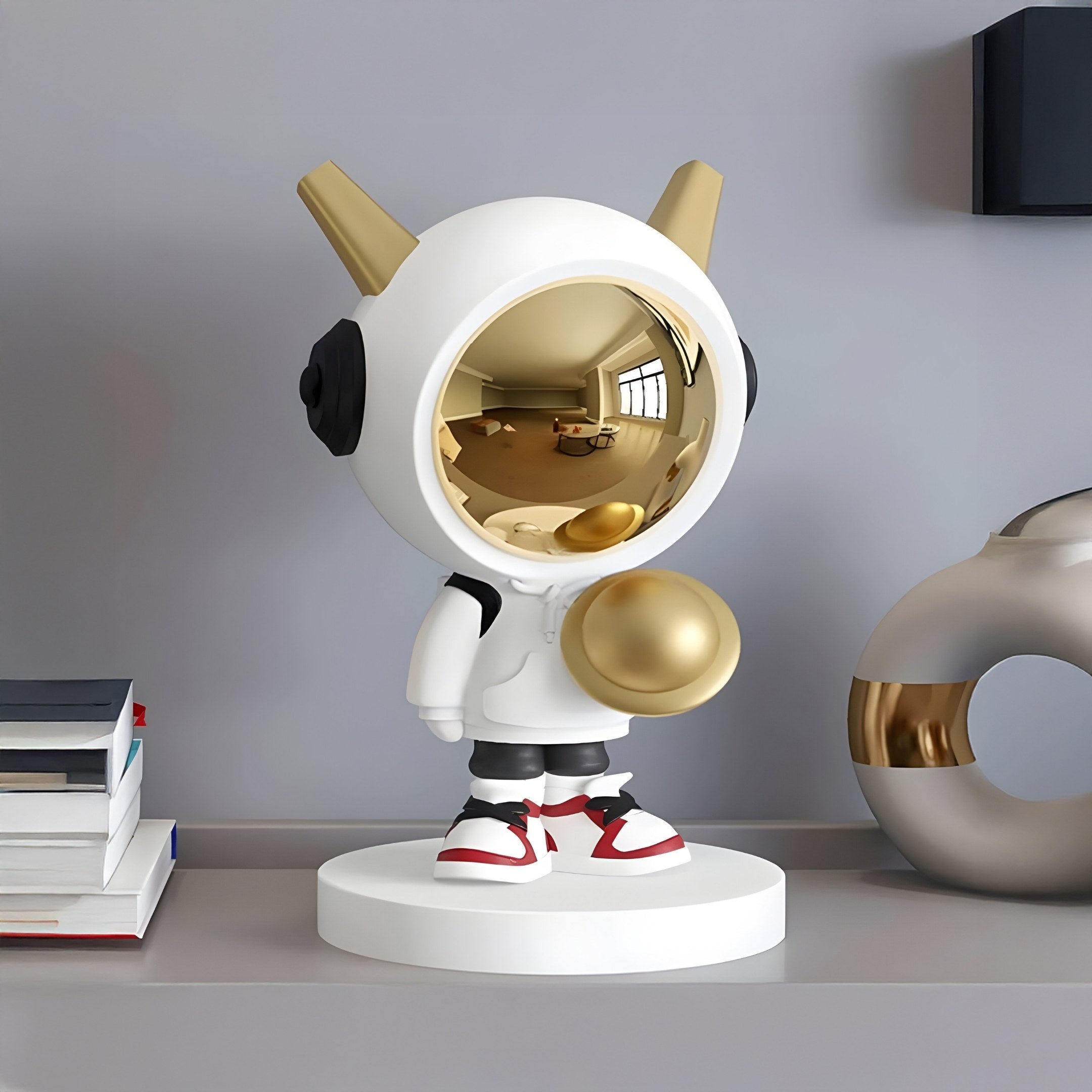 Invite a touch of futuristic fun into your home with the Nova White Astronaut DJ Figure measuring 30 cm in height. This resin-crafted piece stands out through its bright white finish, contrasted by a reflective gold visor that adds a compelling visual twist. Small antenna-like details on the helmet hint at outer space adventures, while the rounded gold accent on the torso evokes the idea of a DJ’s turntable. The figure’s trainers incorporate red highlights, giving it a lively urban vibe that combines well with its cosmic theme. Whether positioned on a desk, bookshelf, or coffee table, its compact form ensures it grabs attention without taking over the space.