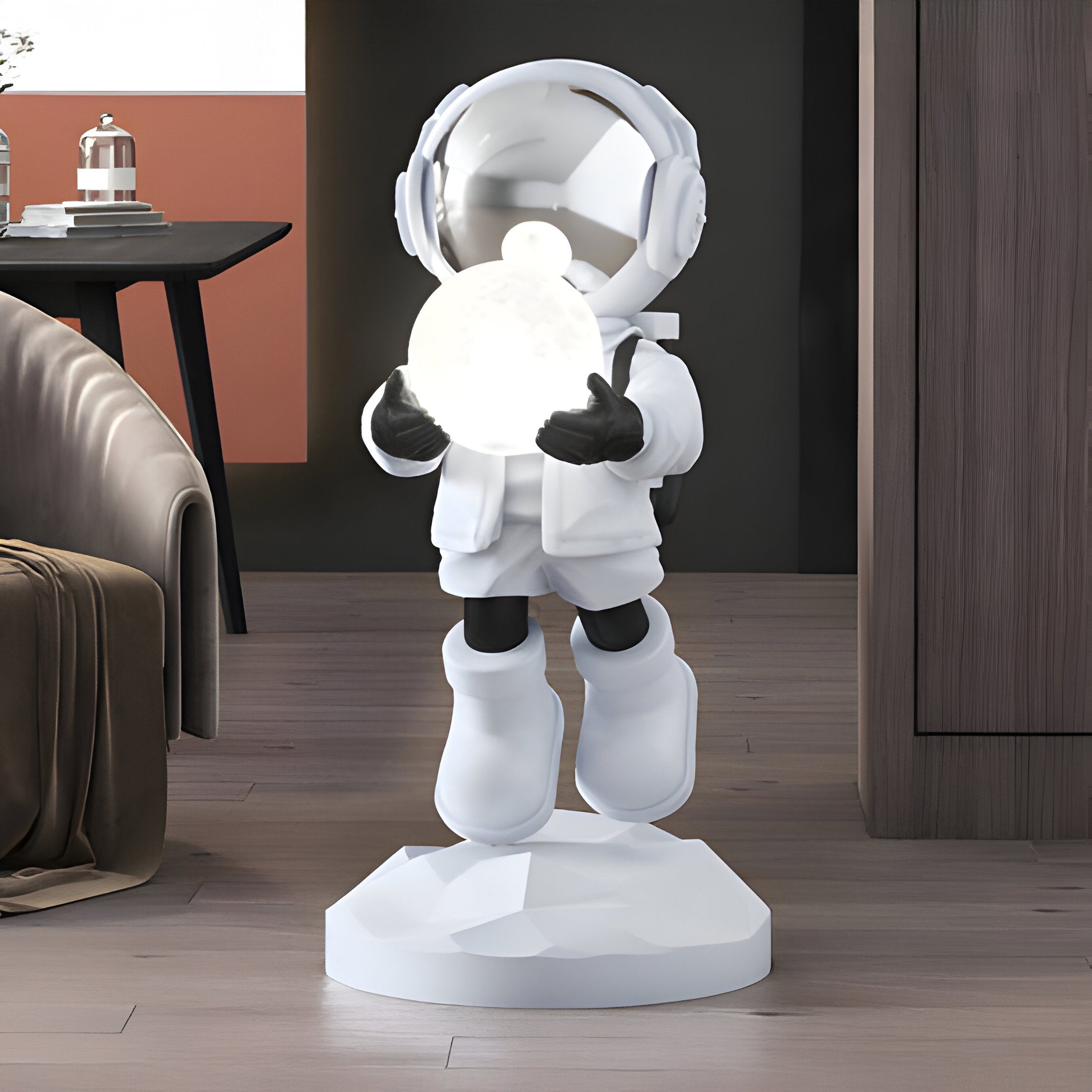 Introduce a bright cosmic element to your interior with the Nova White Astronaut Glow Hover Sculpture, standing 120 cm tall. This battery-powered lamp, complete with USB charging and a tap-on-the-orb function, offers four lighting colours: white, green, pink, and blue, so you can easily set the mood for different occasions. The astronaut’s crisp white suit and reflective visor catch light from various angles, while the figure appears to hover above its base, adding a playful sense of movement. Holding a softly illuminated orb, it emits a gentle glow that works well for calm evenings at home or informal gatherings with friends. Although noticeable in size, the sculpture can be placed in living rooms, bedrooms, or hallways without overwhelming your existing décor, thanks to its balanced proportions and neutral palette.