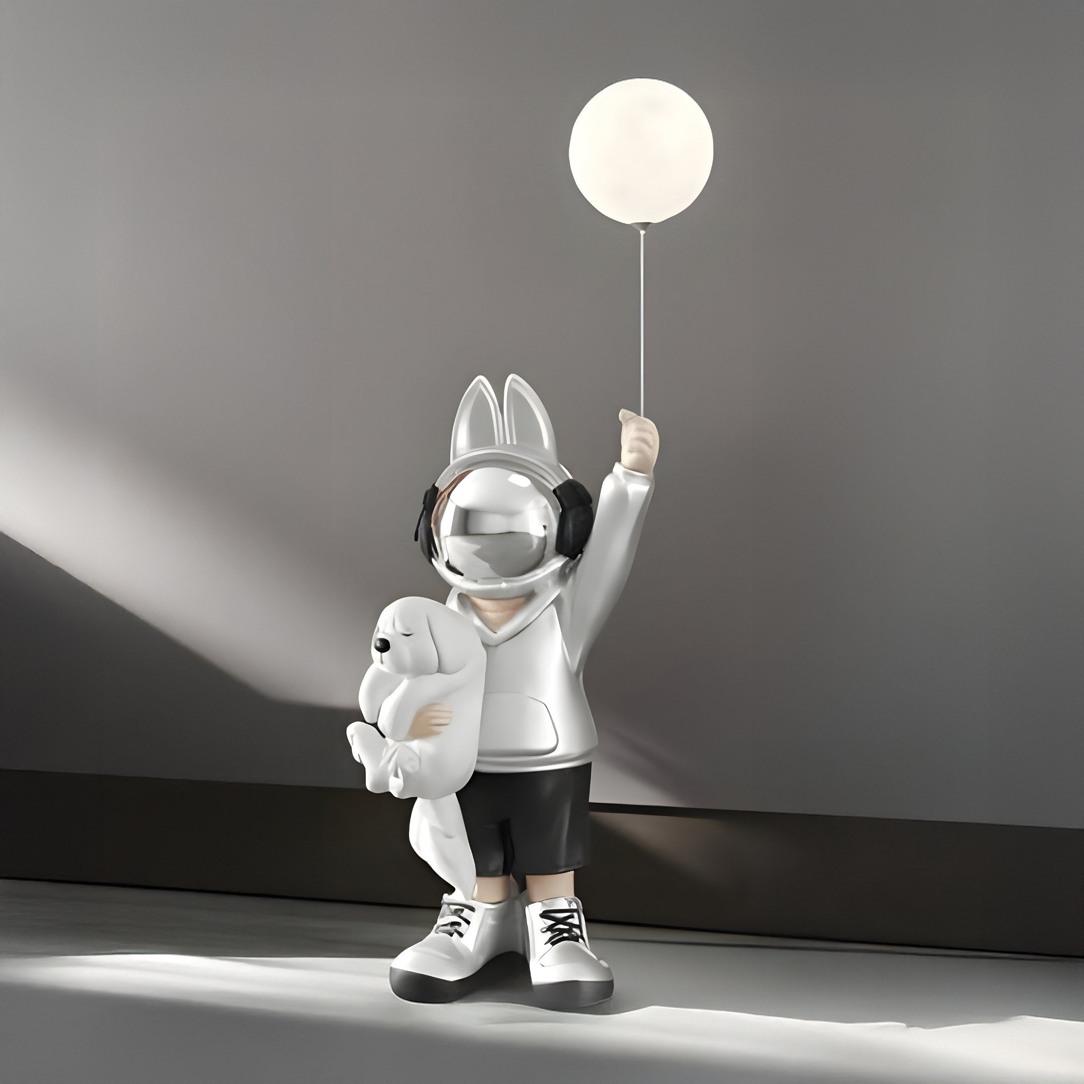 Bring a modern cosmic vibe to your interior with the Silver Astronaut Bunny Pup Glow Balloon Sculpture 130 cm. This playful figure features a reflective silver astronaut with bunny ears, cuddling a friendly pup, while a glowing balloon brightens your space in four vivid colours: white, green, pink, and blue. A rechargeable battery powers the balloon through a USB connection, making it easy to keep illuminated at any time. The astronaut's jacket shows realistic folds, and the pup adds warmth to the futuristic design. If you love space themed décor or eye catching statement pieces, this sculpture stands out as both a conversation starter and a functional light source.