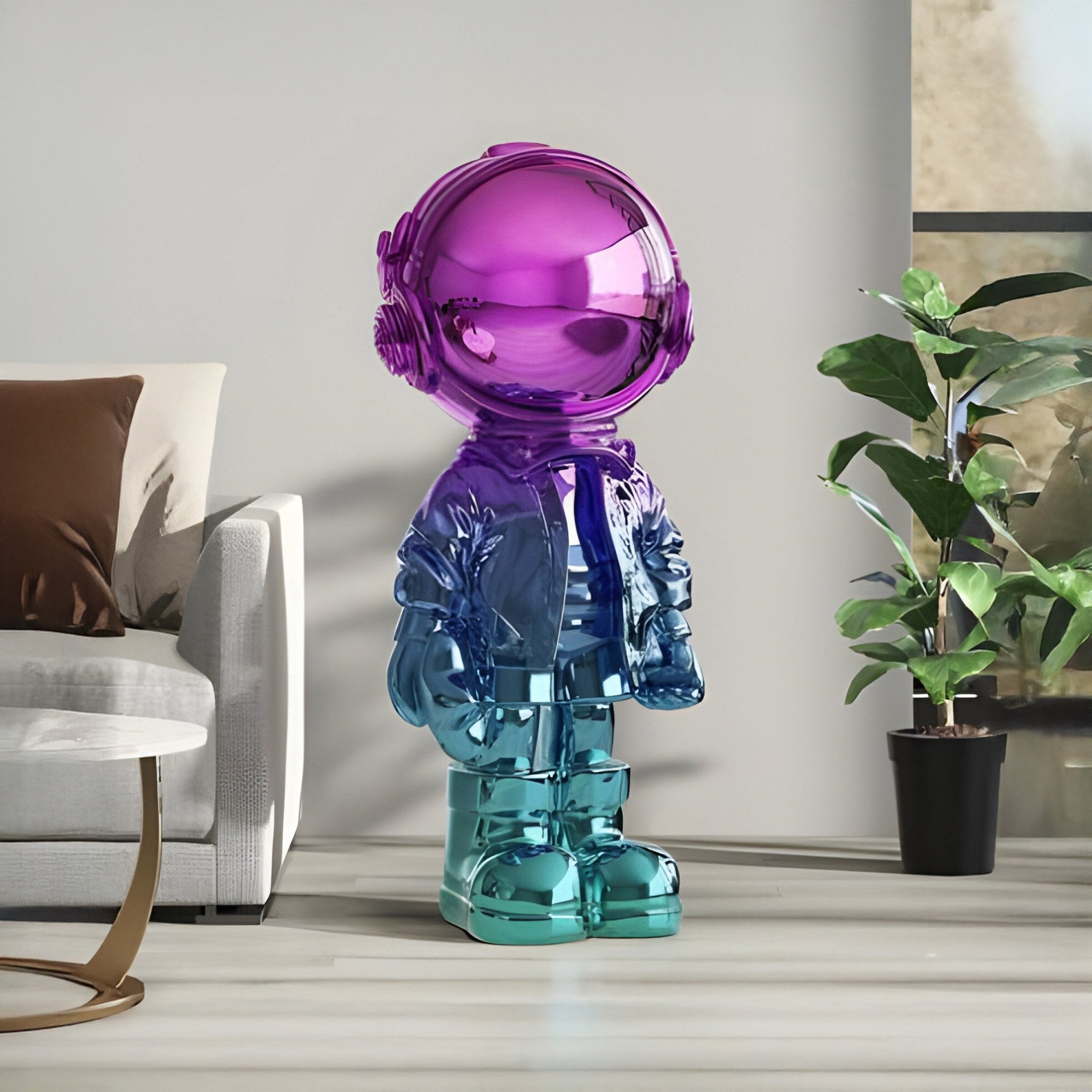 Standing 70cm tall, this figure fits comfortably in spacious areas such as lounges, offices, or hallways. Position it near a window to let natural light emphasise the purple-to-teal transition, or place it under a spotlight for added drama. While primarily intended for indoor use, it can also occupy a sheltered patio if you want to extend your cosmic theme outdoors. The durable resin material ensures longevity, so you can appreciate its unique design for years to come. Pair it with other space-inspired pieces for a cohesive arrangement, or let it shine solo as a conversation starter. In either case, the Vibrant Gradient Astronaut Beats Sculpture highlights a sense of curiosity and imagination, inviting you to look beyond the ordinary and celebrate the boundless possibilities of the universe.