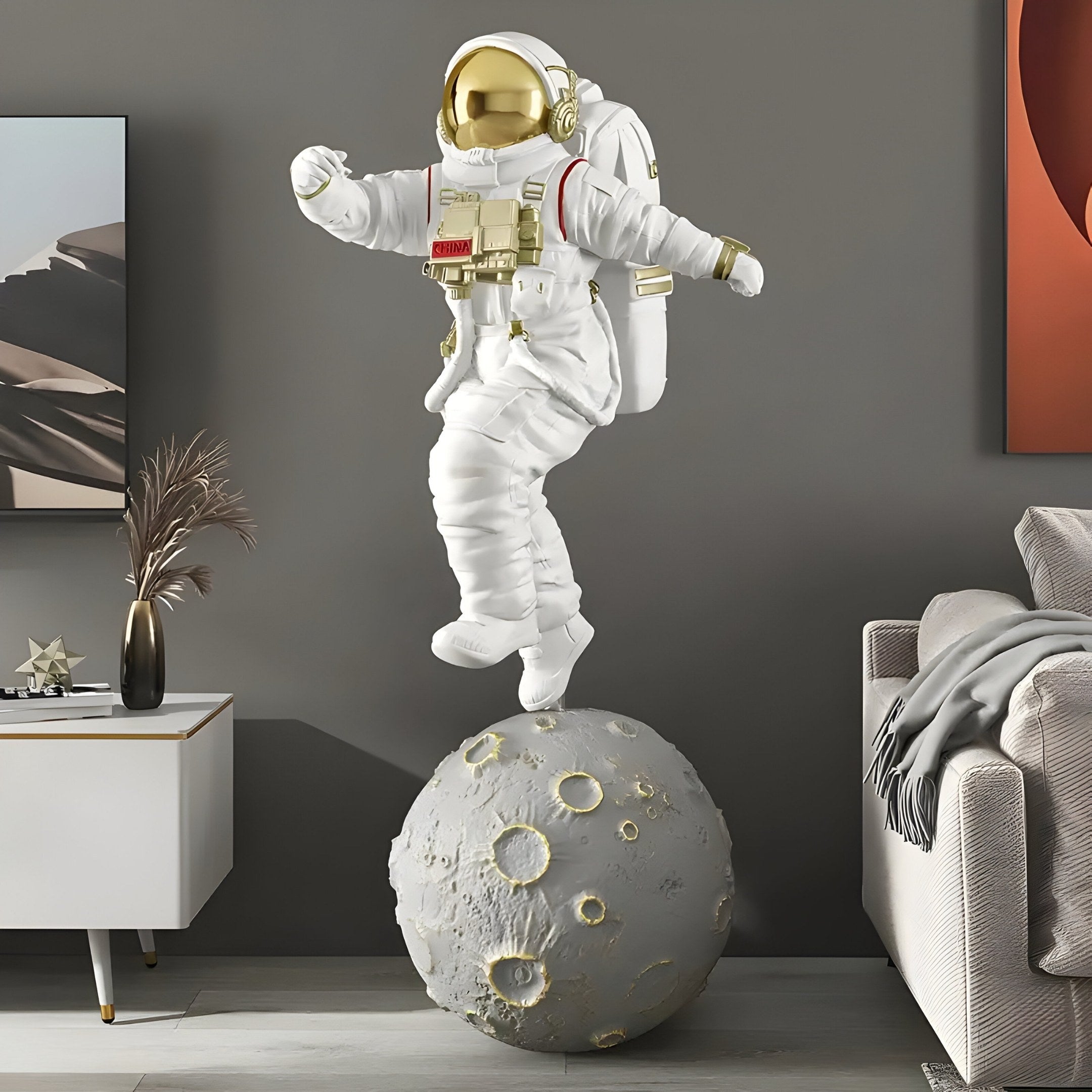 This White Space Astronaut Moon Strider Sculpture at 123cm brings an otherworldly charm to indoor décor. The astronaut, dressed in a white suit with subtle red stripes, appears to step confidently onto a cratered Moon base. A reflective gold visor adds a bright accent, standing out against the neutral grey of the lunar sphere. Crafted from resin, the figure merges durability with imaginative design, offering a conversation starter for living rooms, offices, or spacious hallways. Every detail, from the defined backpack to the astronaut’s forward-leaning stance, hints at the thrill of exploring unknown terrain. If you’re drawn to space-themed pieces or simply want an eye-catching ornament, this sculpture offers a focal point that sparks curiosity.