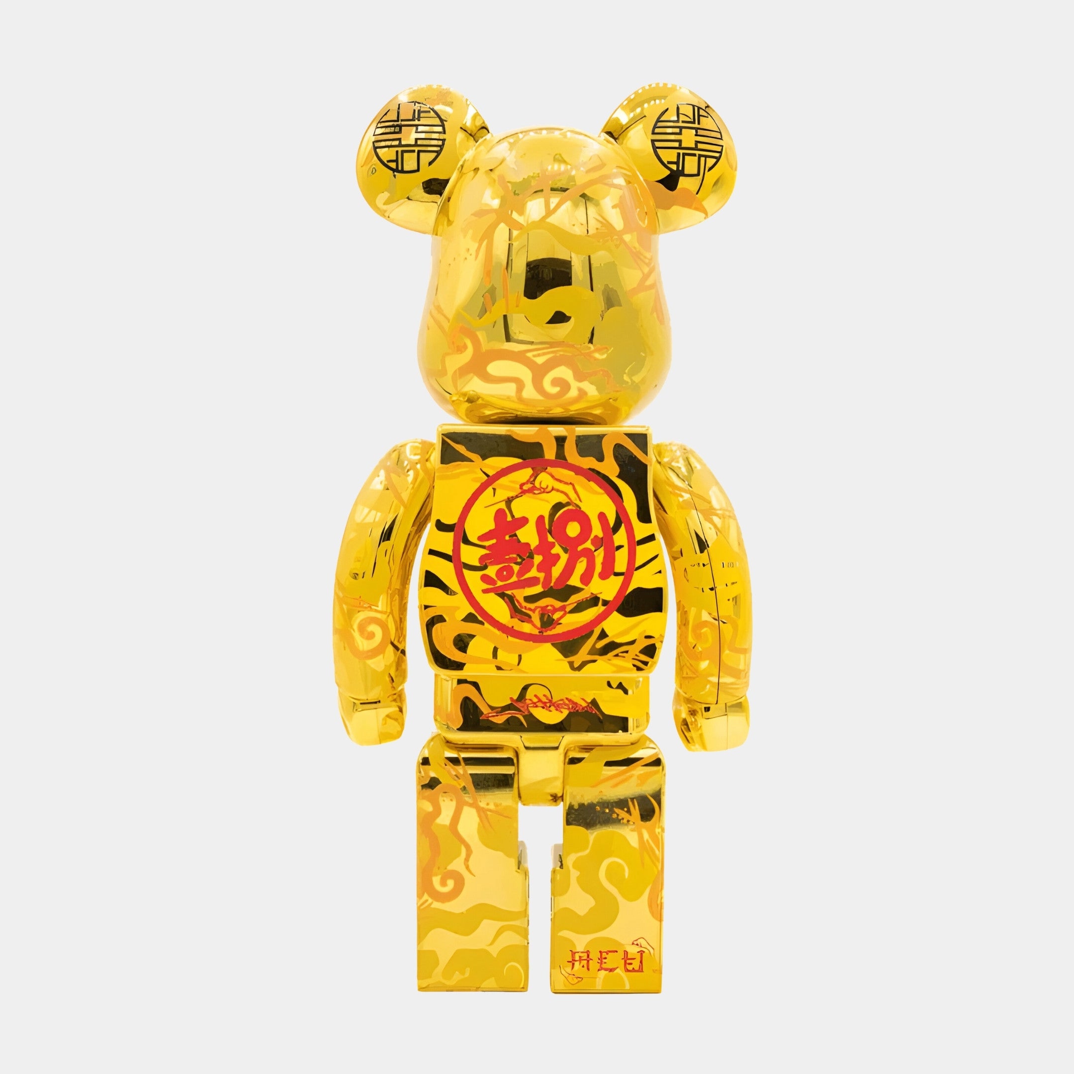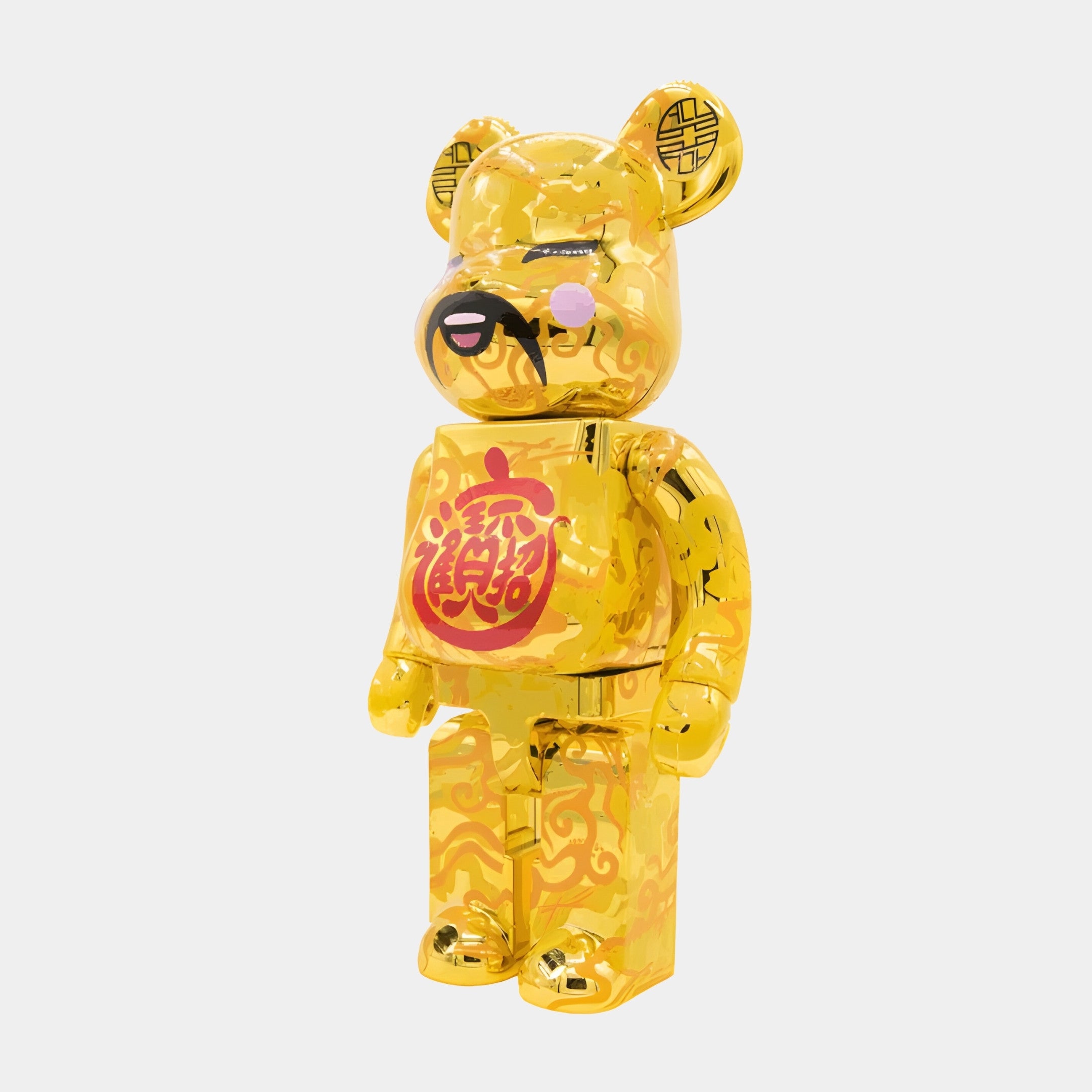 Celebrate abundance with the Chinese Charm Gold Bear Sculpture, a 70 cm resin figure clad in mirror-bright gold chrome and detailed with festive motifs. Intricate swirling cloud patterns flow across the ears, limbs and boots, their glossy surface reflecting ambient light like polished lanterns. On the chest, a bold red gourd encloses the calligraphic character 福 (fu – good fortune), applied through high-resolution pad-printing so every brushstroke stays crisp. Delicate peach-pink blush marks and a traditional scholar’s moustache give the bear a playful, auspicious expression, while black longevity symbols adorn each ear for extra blessing. A UV-stable clear coat seals the plating, wiping clean with a single microfibre sweep. Every limited-edition piece is hand-numbered and inspected, guaranteeing immaculate chrome and faultless print alignment.